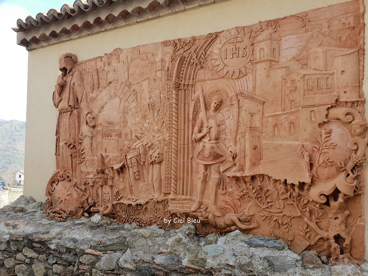 포시아 광장의 이탈리아 조각가 쥬세페 마살로의 조각상과 성당 가는 길의 테라코타 부조