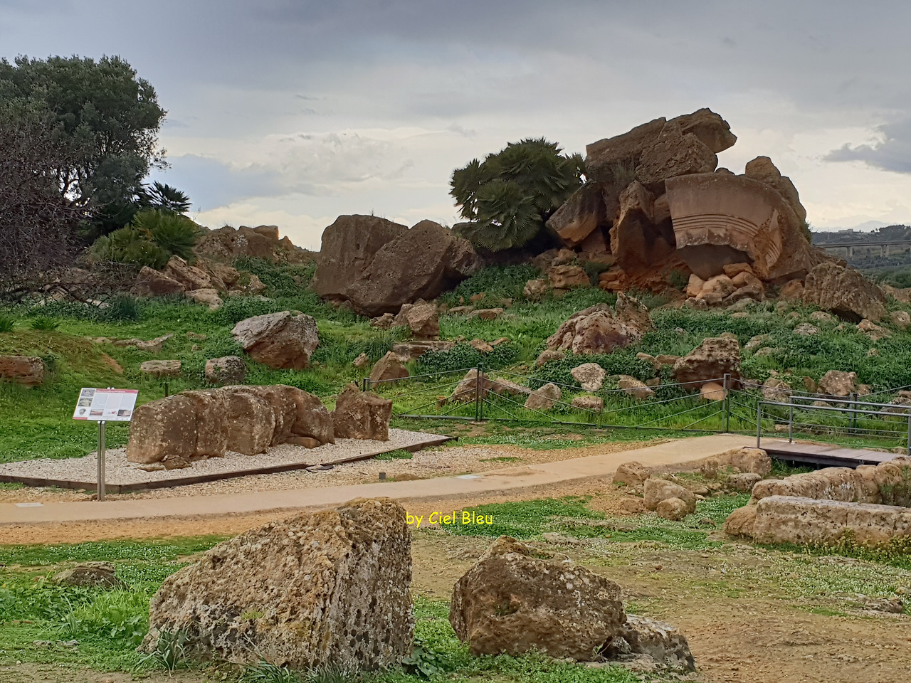 쌍둥이 신전을 지나면 바로 제우스의 신전터가 나온다. 제우스의 신전은 어딜 가도 대체로 완전 파괴된 모습이 많다. 그에 반해 헤라의 신전은 기둥 몇 개라도 서 있고 대충의 형곽이 남아있는데 말이다. 이곳도 예외는 아닌 듯 신전 터에 작은 동산을 이룰 정도의 돌무덤과 기둥 몇 개 만이 덩그러니 남아 있다. 그리고 신전을 받들고 있던 거대한 조각상 텔라몬(Telamon)에 대한 설명이 붙어 있다. 그리스 신화의 거인 족 이었던 아틀라스가 아닌가 생각할 수 도 있으나 그는 제우스와의 전쟁에서 패하고 지구의 끝에서 하늘을 받치고 있는 벌을 수행 중이니 말이다.