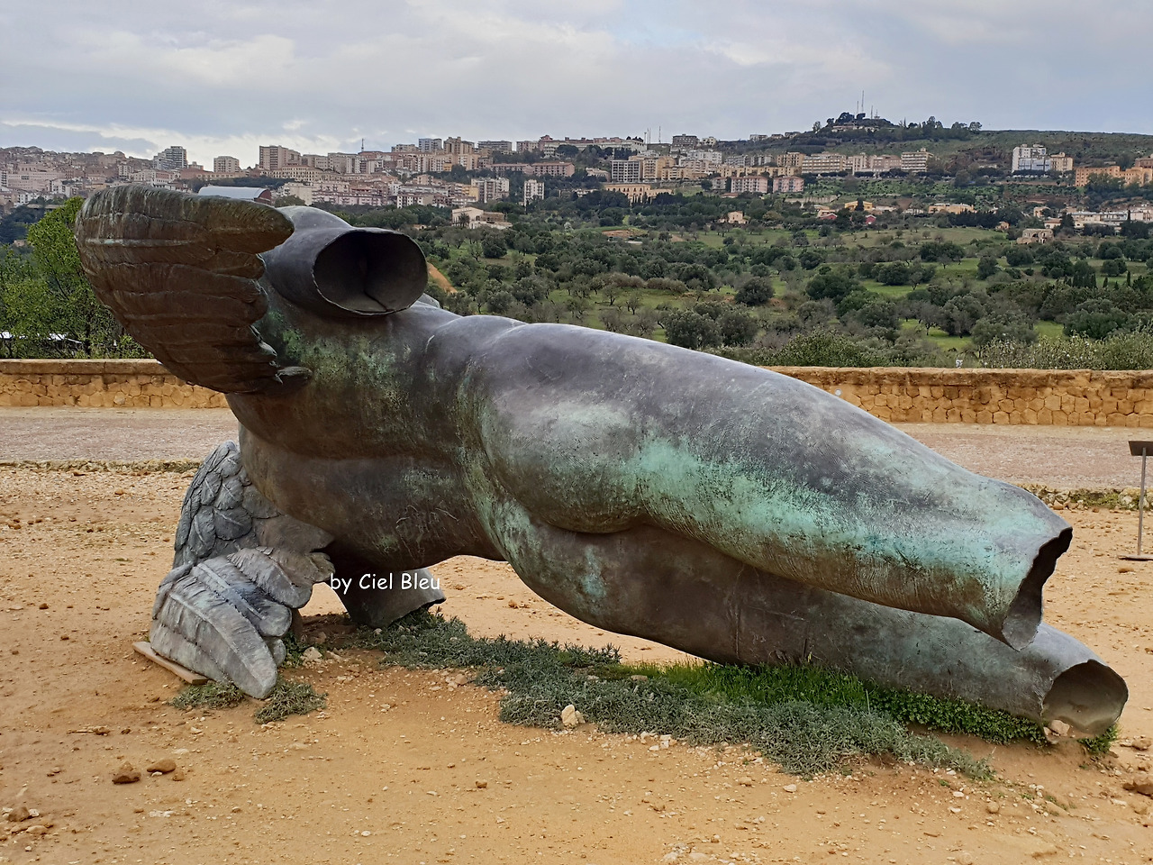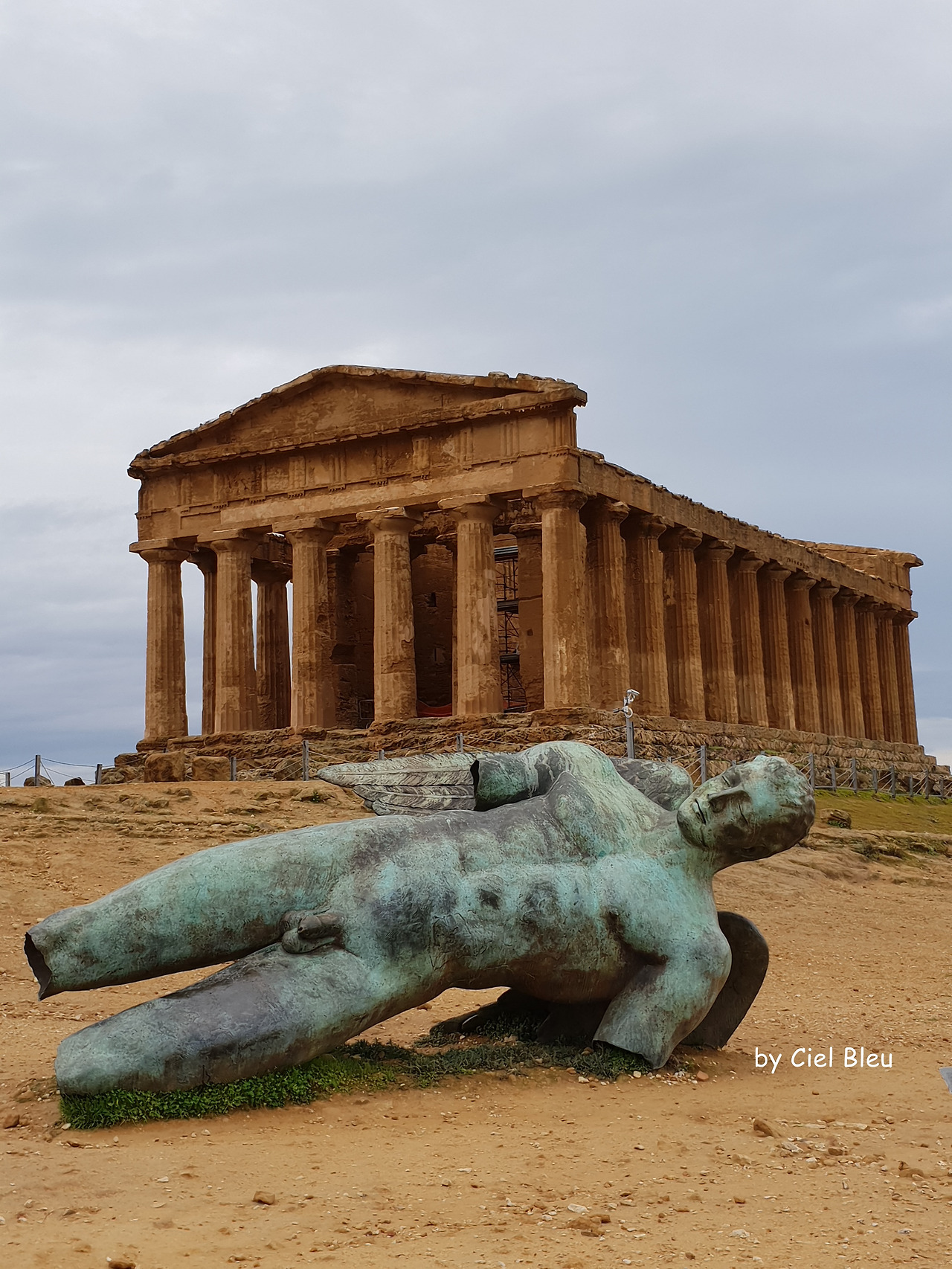 그런데 신전 앞에 땅으로 추락한 이카루스의 동상이 전시되어 있다. 아그리젠토 관광 사진에서 많이 보던 바로 그 조형물이다. 고대 그리스 유적지에 이런 조형물을 설치하는 것에 의견이 분분했다고 한다. 2011년, 폴란드 조각가 '이고르 미토라이(Igor Mitoraj)'의 작품이다. 꽤 오랜 시간 조형물을 설치해 놓고 있는 것을 보면 반응이 괜찮은가 보다.