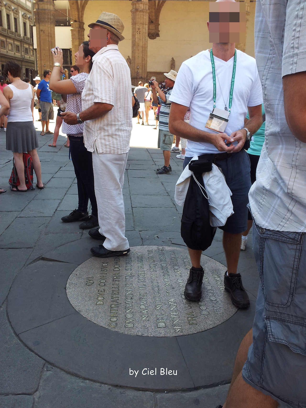 피렌체의 중심부 시뇨리아 광장(Piazza della Signoria)의 수많은 인파들이 우피치와 베키오 궁 등 끝없이 펼쳐지는 르네상스의 걸작들을 정신없이 감상하는 동안 광장 중앙의 바닥에 햇빛을 받아 반짝이는 금속 표시를 눈여겨보는 이는 별로 없다.