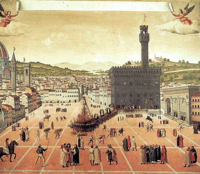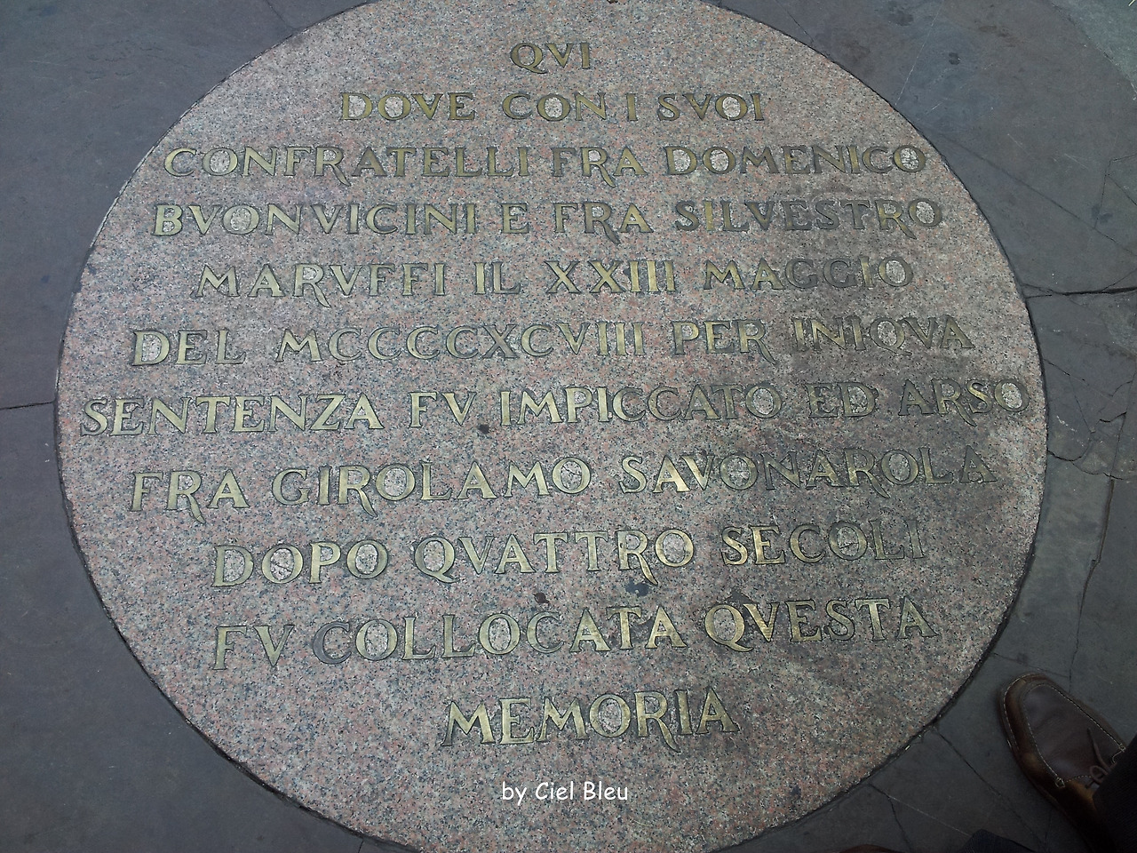 결국 로마교회는 그를 이단자로 몰아 사형에 처하게 되는데 1498년 5월 23일 시뇨리아 광장, 현재의 청동 표지가 있는 바로 그 자리에서 그는 화형에 처해졌다.