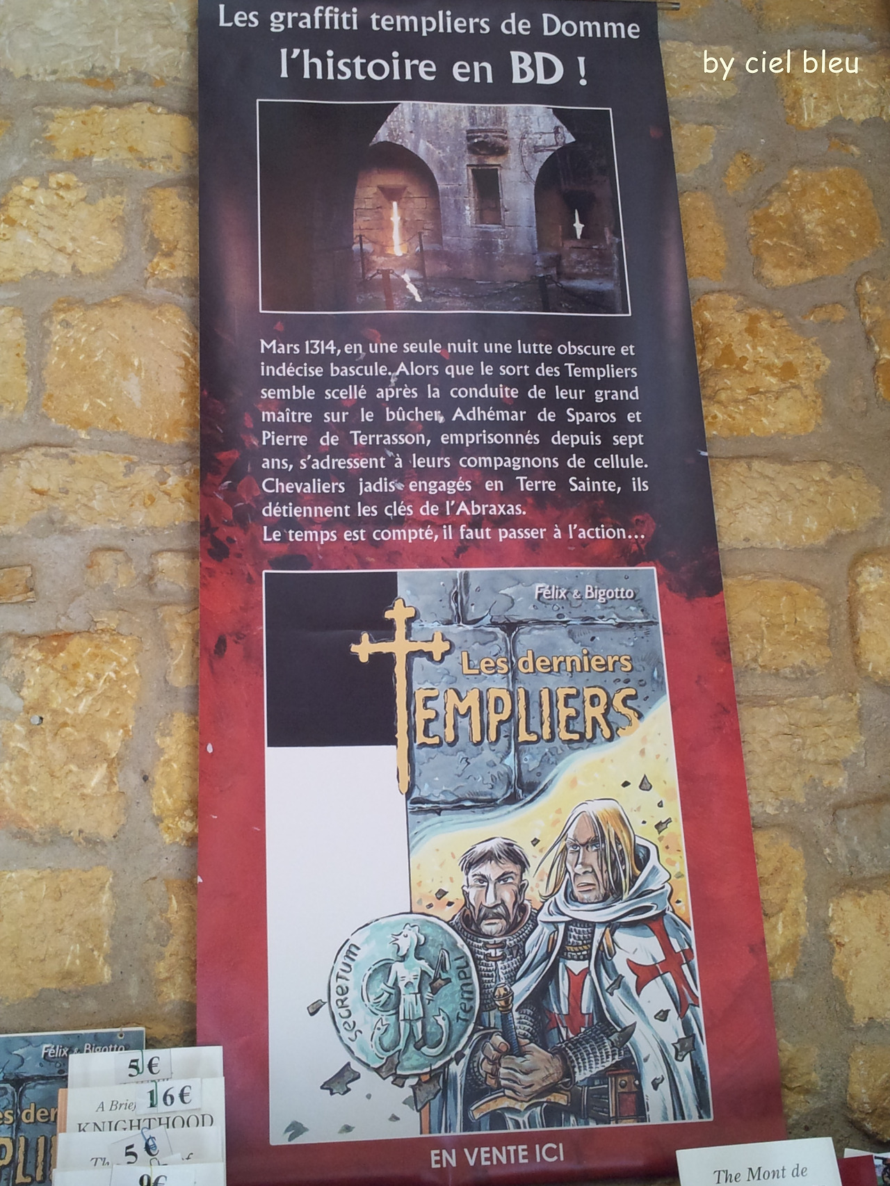 '13일의 금요일(https://brunch.co.kr/@cielbleu/27 참조)'의 유래가 된 템플 기사단의 수장 '자크 드몰레'의 화형식 이후 살아남은 마지막 기사들이 도르도뉴의 조그만 마을 돔(Domme)의 감옥에 7년여를 갇혀 있으면서 감옥 벽에 남겼다는 미스터리 한 그라피티(grafitti)를 대면하면 마치 중세의 한 장면으로 빨려 들어간 듯한 느낌에 빠지게 된다.