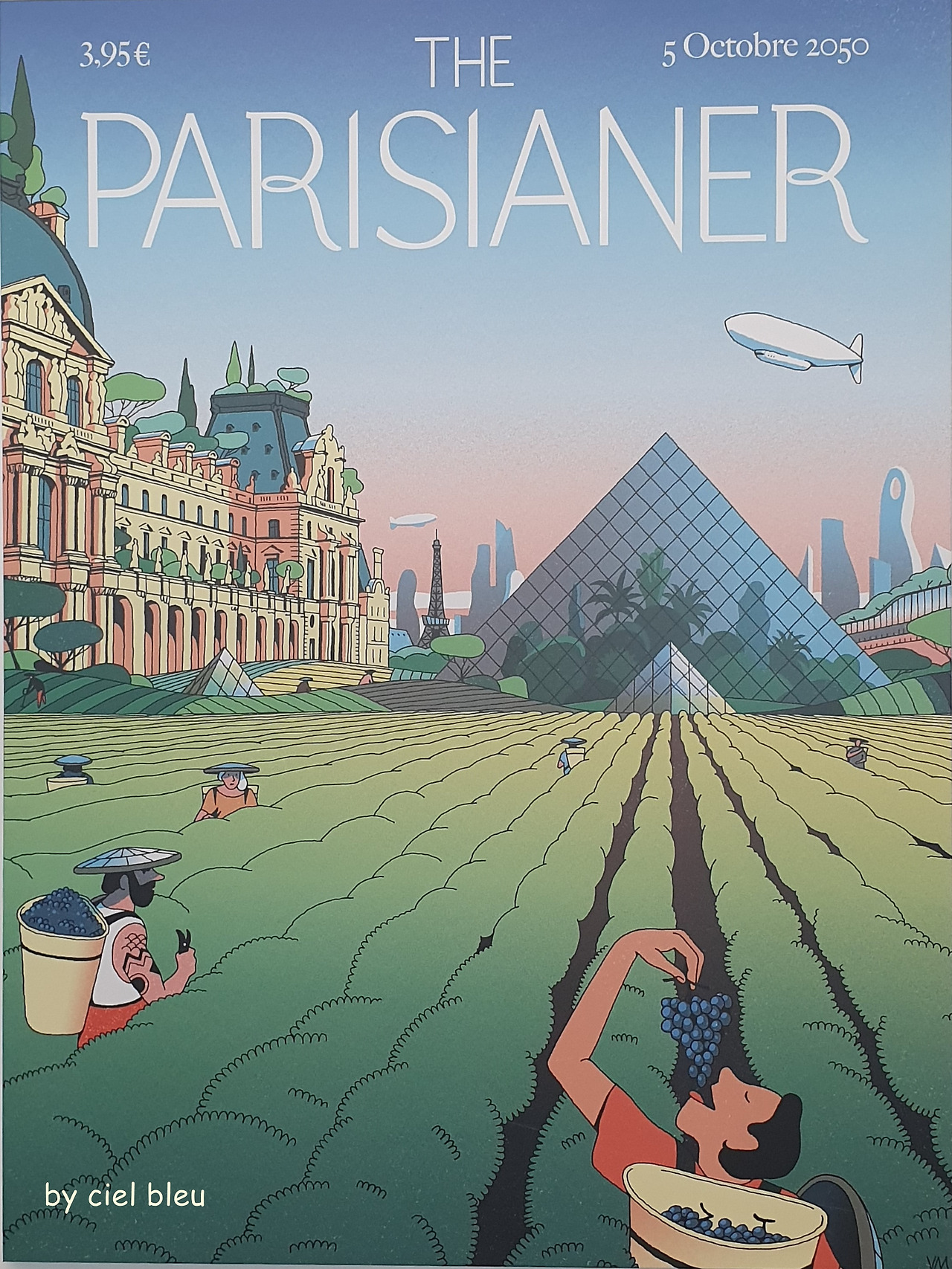 2050년 파리의 모습을 풍자한 재미있는 포스터(루브르 앞 광장이 포도밭이 되었다.)