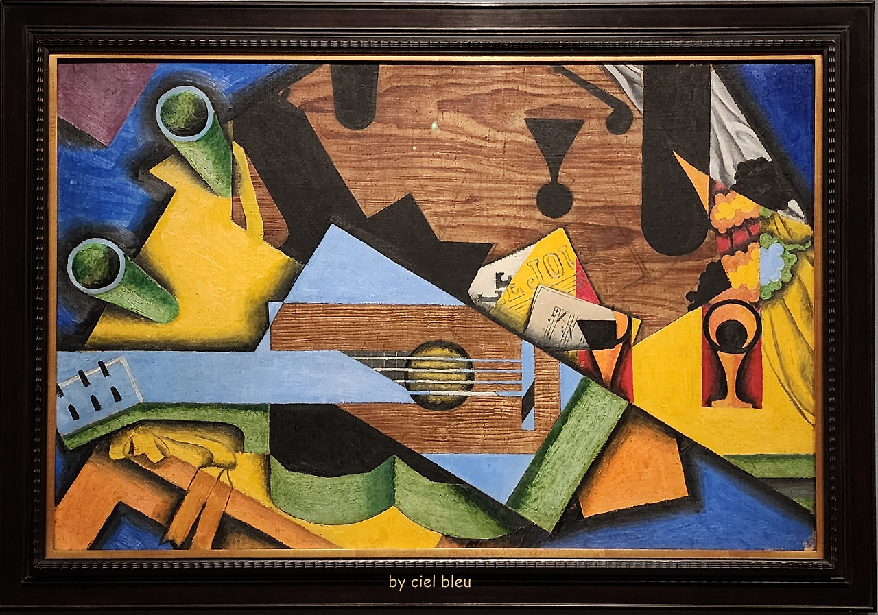 후안 그리스의 다음 작품은 단순히 기타만 그려 넣은 것이 아니라 자연적으로 맞지 않는 그림자를 그려 넣는가 하면 당시 아방 가르드를 지향하던 시대상도 그려넣음으로 현실 세계를 화폭에 넣은 것이라는 설명이다.