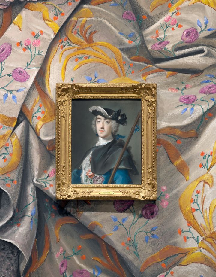초상 파스텔화의 대가 '로살바 카리에라(Rosalba Carriera:1673-1757)'의 작품 'Portrait of a Man in Pilgrim's Costume'을 '모리스 캉탱 드 라 투르(Maurice Qauantin La Tour:1704-1788)'가 그린 '마담 퐁파두르의 초상(Marquise de Pompadour)'의 의상 한 부분을 커튼처럼 배경으로 하고 있는 사진이었다.