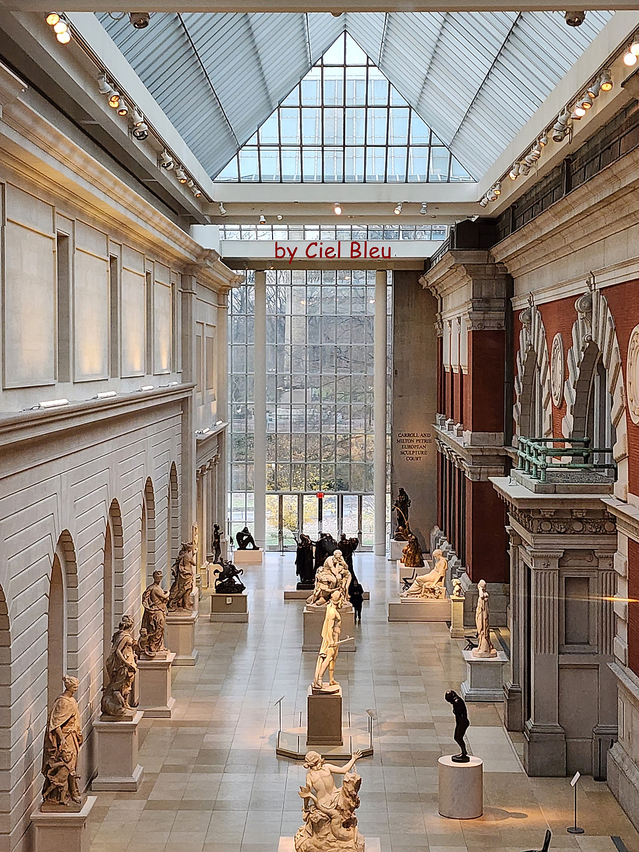 창밖으로는 이집트의 오벨리스크가 보이고 많은 조각상들이 진열되어 있는 'European Sculpture & Decorative Arts' 홀의 한쪽 벽.