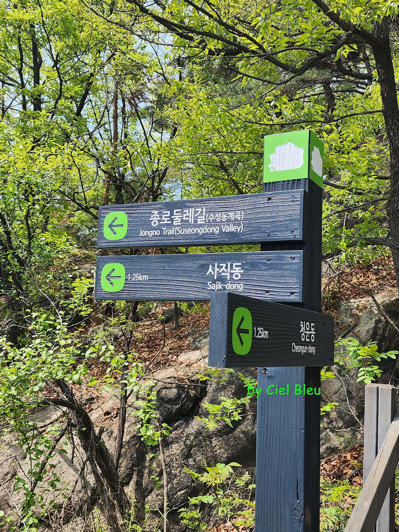 그런데 산길에 계속되는 내리막이 어디 있겠으며 거의 시작점에서 만난 안내판에 적힌 '수성동 계곡'까지 거의 3km라는 표지판을 본 순간 아차 하는 마음이 든다.