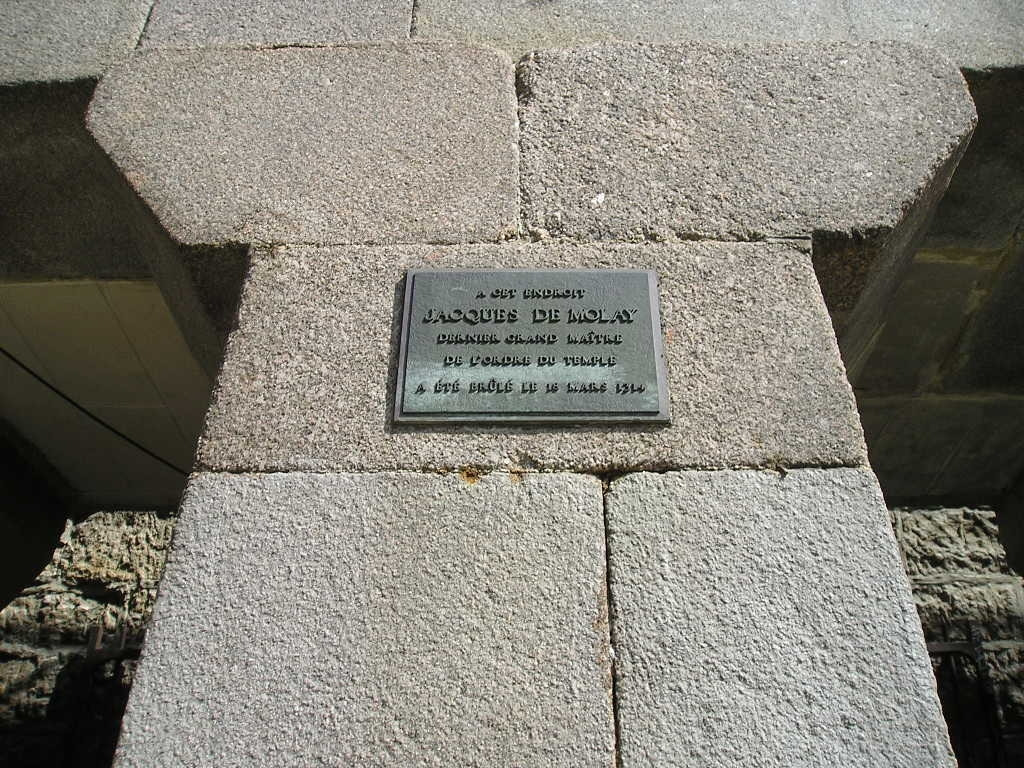 '템플 기사단(Knights Templar)의 수장 '자크 드 몰레(Jacques de Molay, 1244~1314)가 화형을 당한 곳'이라는 내용이다.