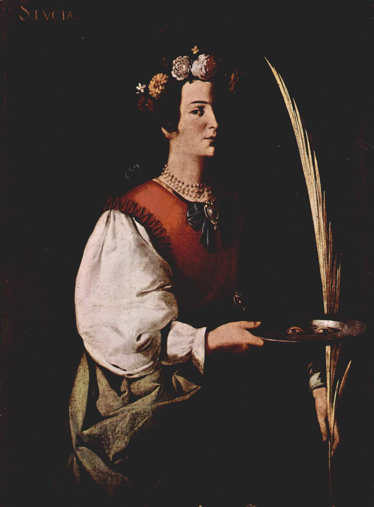 프란시스코 데 수르바란(Francisco de Zurbaran), 워싱턴 내셔널갤러리깊은 신앙심으로 동정 서원(평생 혼인하지 않고 하느님을 모시고 삶)한 성녀로, 두 눈을 쟁반에 담아 들고 있는 모습으로 그려진다.