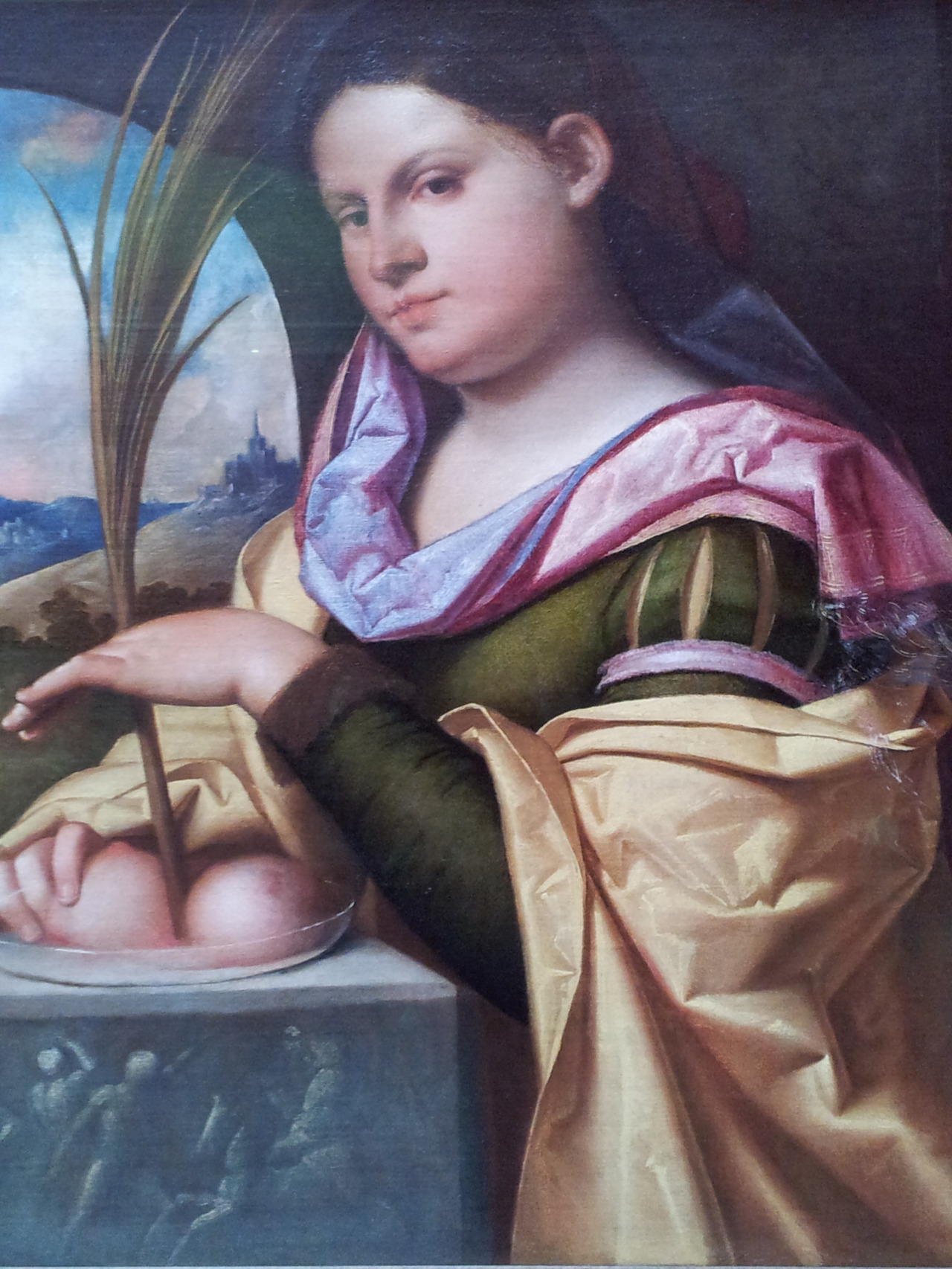 조반니 카리아니(Giovanni Cariani), 에든버러 내셔널 갤러리시실리의 카타니아 지역 성인으로, 주로 두 가슴을 쟁반에 담아 들고 있는 모습으로 표현된다. 로마 왕의 종교 박해에도 굴하지 않고 자기 신념을 강변하다가 스무 살 나이에 가슴을 잘리는 고문을 당하고 순교한 성녀다. 아그네스, 루치아, 세실리아와 함께 기독교의 네 동정녀 순교자 중 한 사람이다.