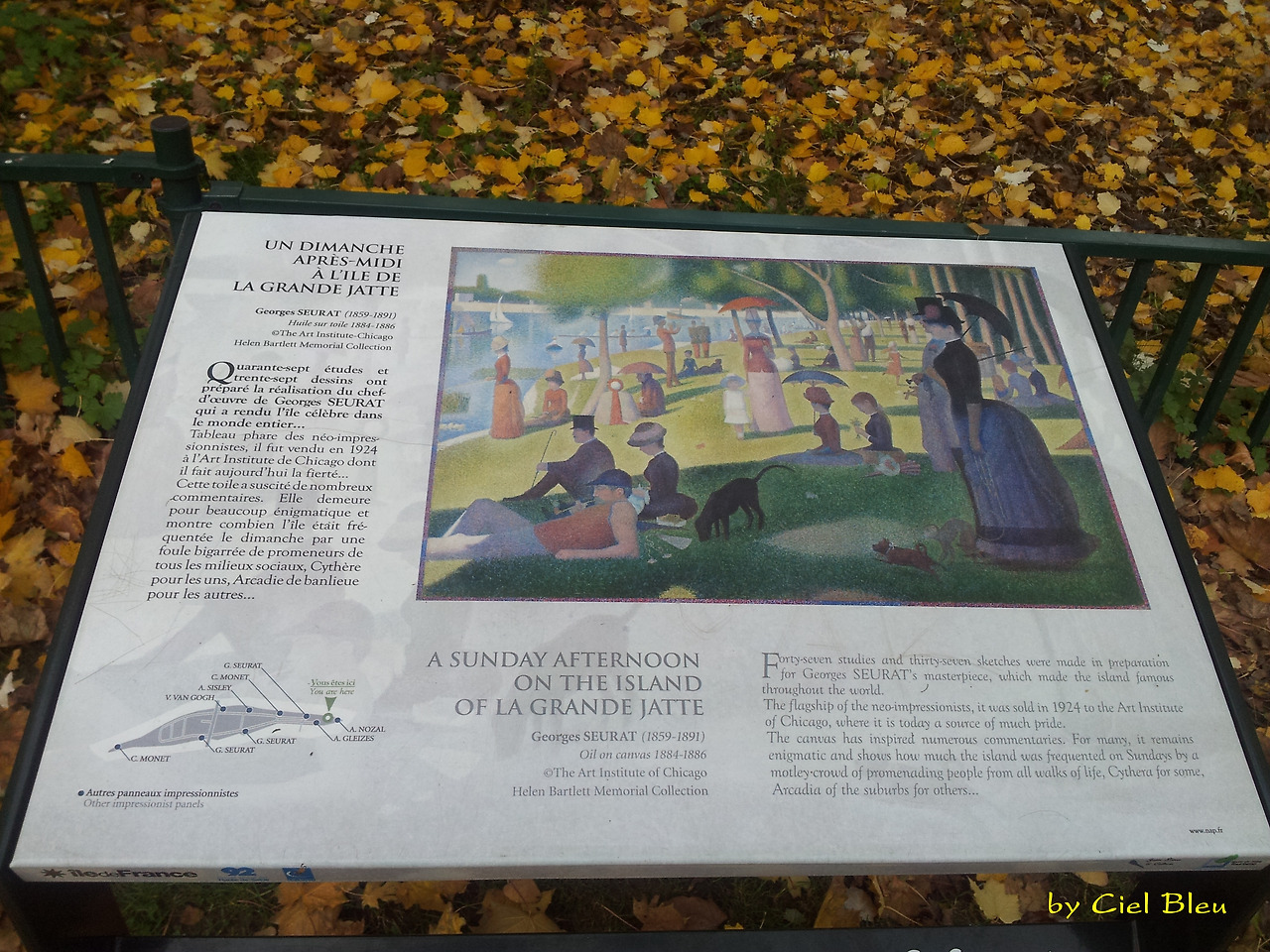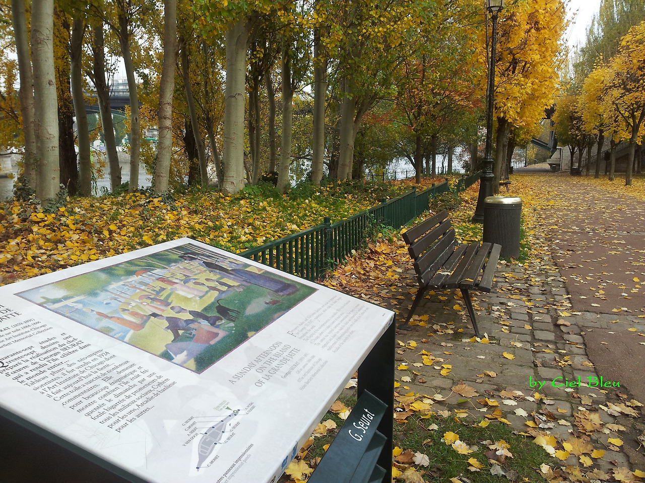 그랑자트 섬은 길이 2킬로미터, 폭 200미터로 기다란 모양을 하고 있는데, 그림의 배경이 된 곳은 섬의 중간쯤에 있는 다리 위쪽에 있었다. 마침 내가 찾아간 날이 단풍이 아름다운 가을이어서 섬의 정취는 그림 속 풍경보다 더 아름다웠다. 하지만 무엇보다 이 섬에서 ‘쇠라’라는 이름을 본 순간의 감동은 마치 내가 그의 그림 속의 인물이 된 듯한 느낌을 주기에 충분 했다.
