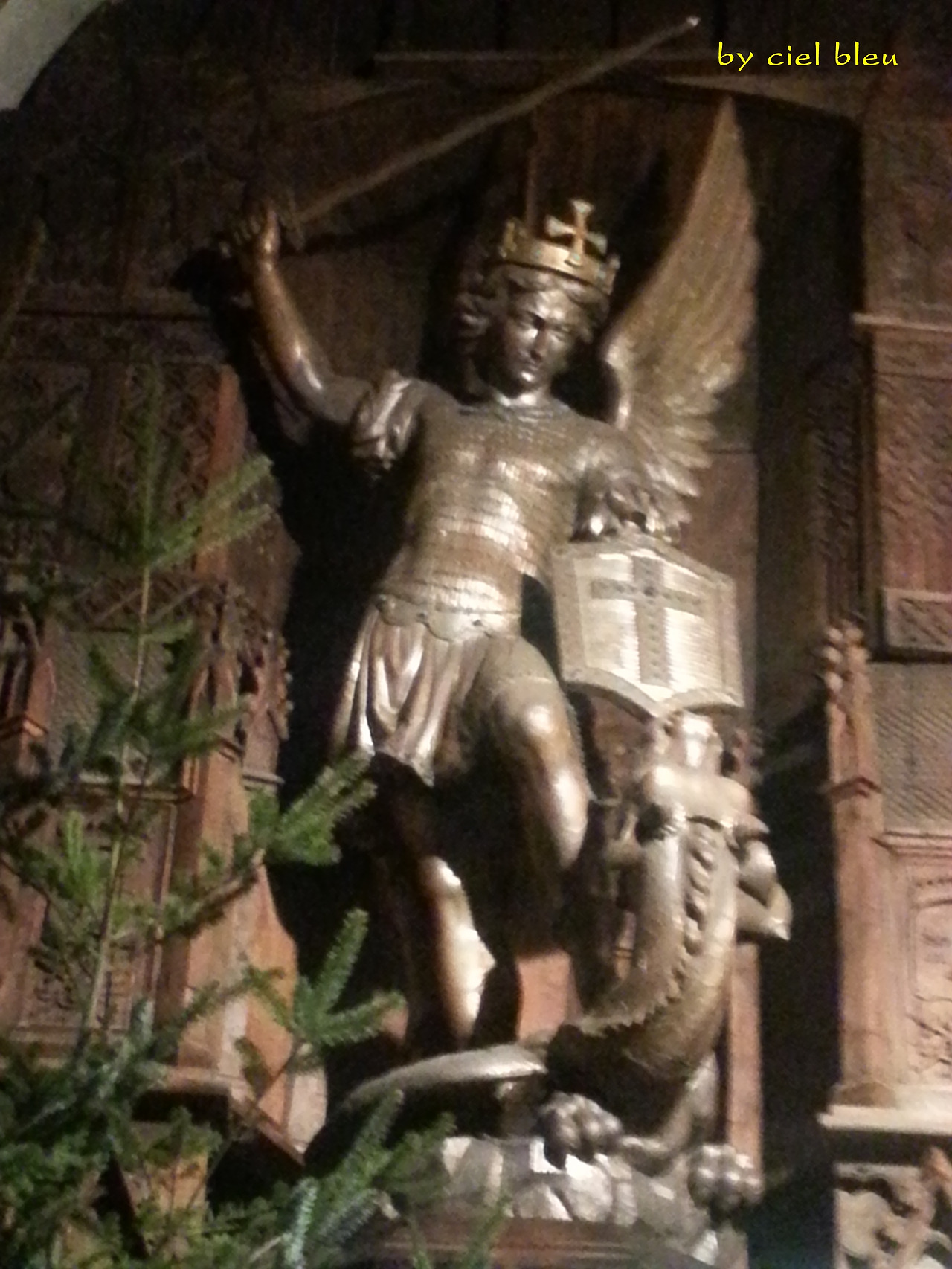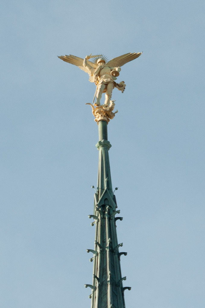 그런가 하면 수도원의 지붕 맨 꼭대기에는 2.7m 크기의 미카엘 대천사의 금 동상이 있는데 이것은 1895년 프랑스의 조각가 프레미에(Fremiet)가 만든 작품으로 수도원의 역사에 비하면 상당히 최근 작품이다. 이 천사상은 청동(bronze)으로 만들면 너무 무거워 높이 올릴 수가 없기 때문에 구리(copper)로 만들었다고 한다. 유난히도 반짝이는 현재 첨탑 위의 동상은 1987년에 다시 올린 것이다.