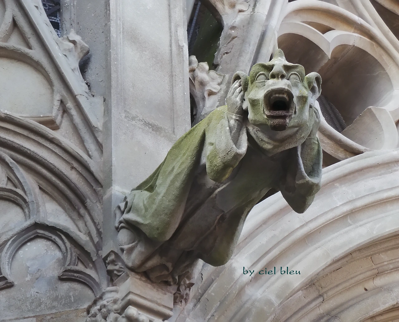 지붕에 쌓인 물을 빼내어 다른 벽들의 침식을 방지하기 위해 건물 둘레에 설치한 장식으로 '가고일'은 7세기경 이 지역에 살던 무서운 용의 이름(Gargouille)에서 유래한 것이라 한다. 루앙(https://brunch.co.kr/@cielbleu/61 참조)의 한 성인이 이 용을 잡아 불에 태웠으나 불을 내뿜던 용의 입은 타지 않고 그대로 있었다고. 용의 입을 교회의 벽에다 걸고 악귀로부터 교회를 보호한다는 의미로 전해 지다 보니 악마 등 상상이나 신화 속 모형들이 등장하기 시작했고 이런 장식을 특히 그로테스크(Grotesque)라고 부른다.
