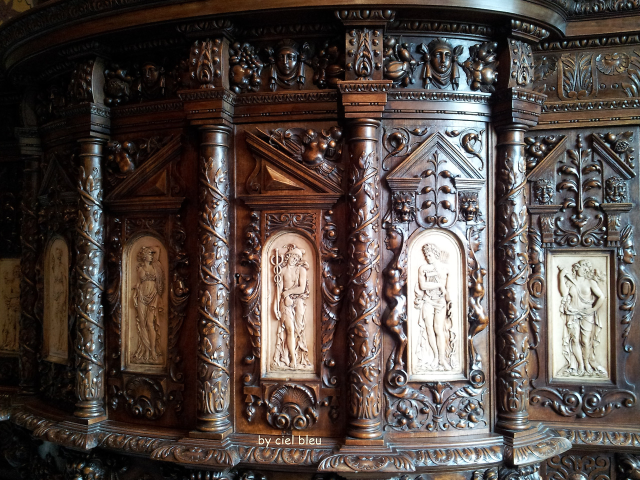 카트린느 드 메디치 방의 화려한 벽난로(그녀와 남편 앙리 2세의 문장이 새겨져 있다)(좌), 정교하게 조각된 장식장