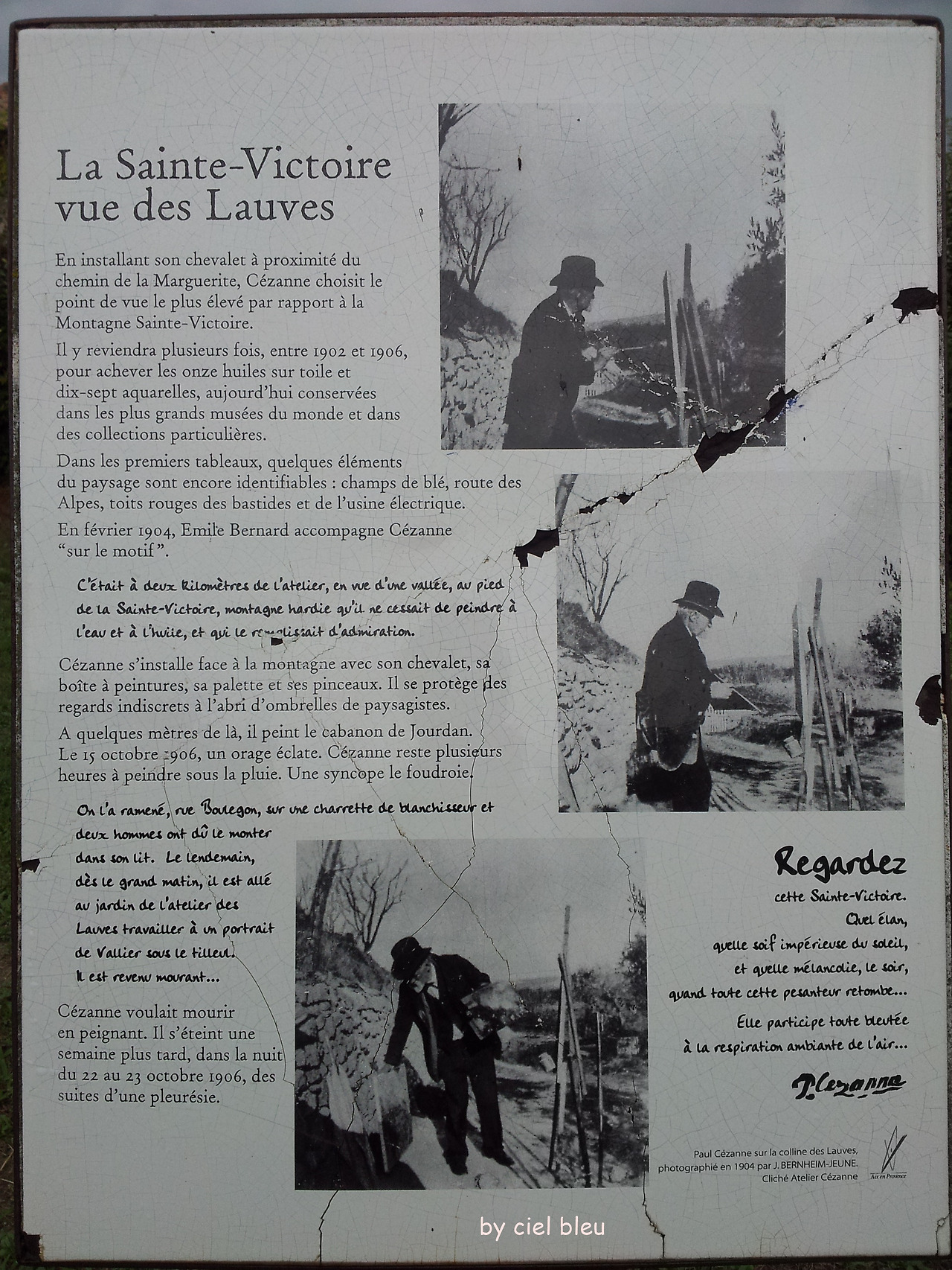 세잔의 스튜디오에서 멀지 않은 곳(Les Lauves, Chemin de Marguerite)에 그가 생 빅투와 산을 화폭에 담았던 나지막한 언덕이 있는데 그곳에 가면 여러 버전(version)의 생 빅투와 산 그림을 전시해 놓아 그의 작품을 이해하는데 도움을 주고 있었다.