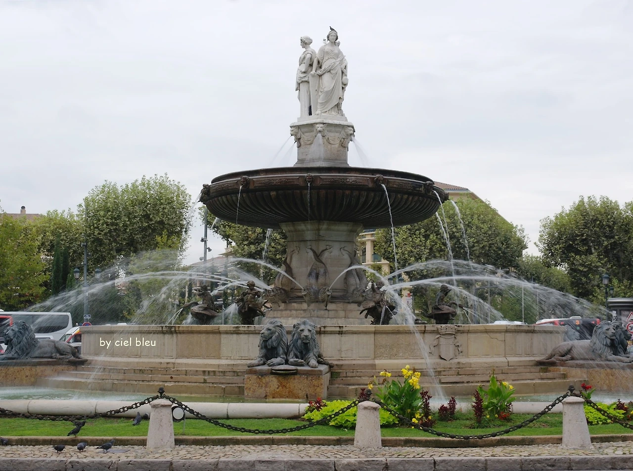 왼 손에 머스캣 포도송이를 들고 있는 ‘르네 왕(King René)(https://brunch.co.kr/@cielbleu/86참조)’의 분수, 로마 시대부터 사계절 내내 수온이 34도를 유지하는 샘물이 계속 솟아났다는 이끼를 뒤집어쓰고 있는 분수(Fontaine Moussue), 이동하던 소와 말들이 먹었다는 분수(Fontaine des Neuf-Canons),예술과 정의와 농업을 상징하는 세 명의 여신이 엑상 프로방스의 입구를 장식하고 있는 로톤 드(Rotonde) 분수가 그들이다.