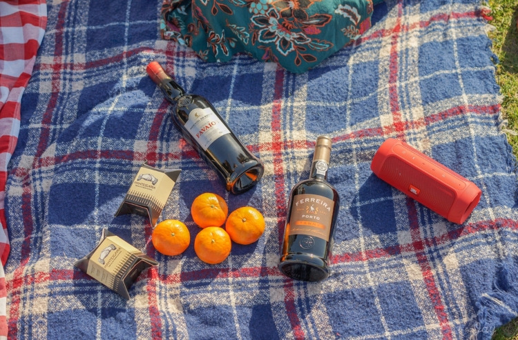 돗자리를 펴고 앉아서 핑고 도세에서 사 온 초록색 봉지의 감자칩과 포트와인을 꺼냈어.