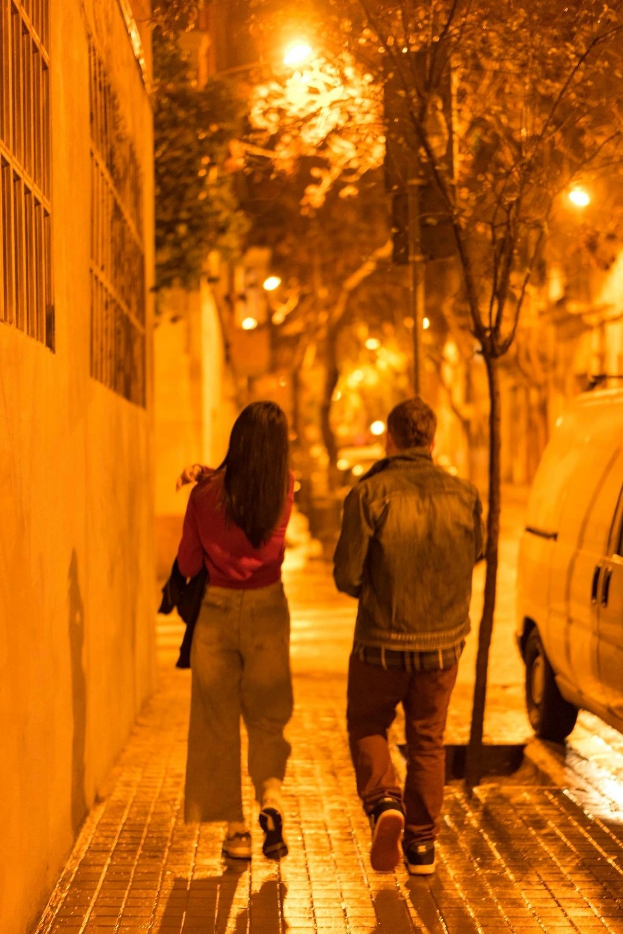 우리는 조용한 밤거리를 거닐어 펍에 도착했어.