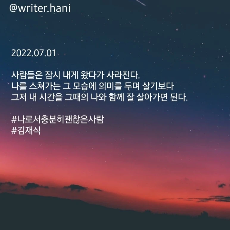 사람들은 잠시 내게 왔다가 사라진다. 나를 스쳐가는 그 모습에 의미를 두며 살기보다 그저 내 시간을 그때의 나와 함께 잘 살아가면 된다.