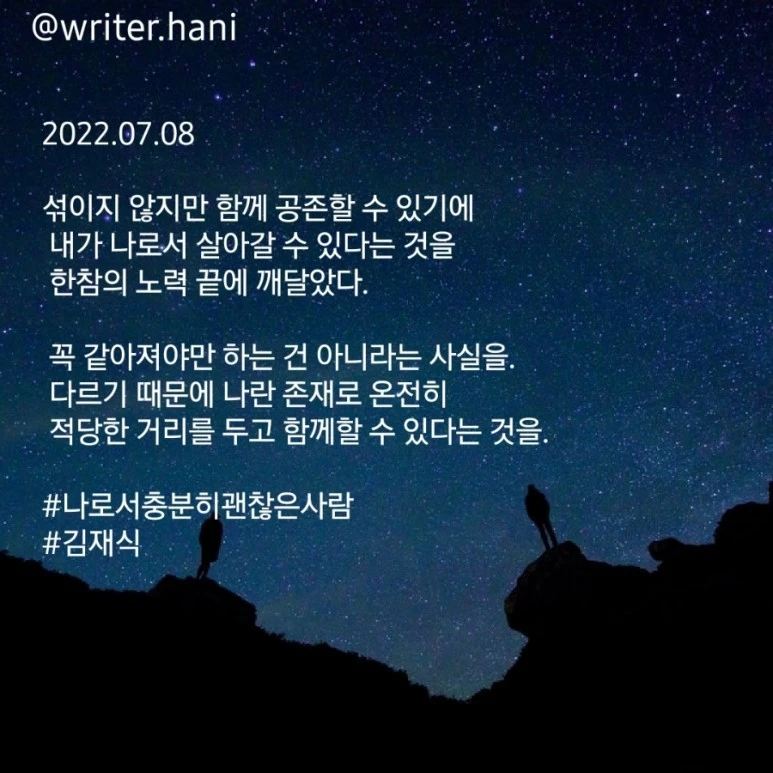 섞이지 않지만 함께 공존할 수 있기에 내가 나로서 살아갈 수 있다는 것을 한참의 노력 끝에 깨달았다.