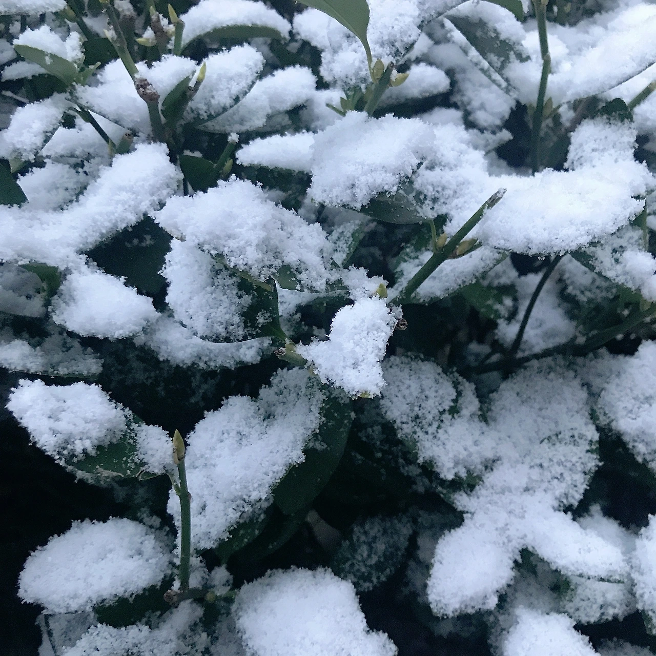 녹색 활엽수에 얹힌 눈이 낭만적이다.