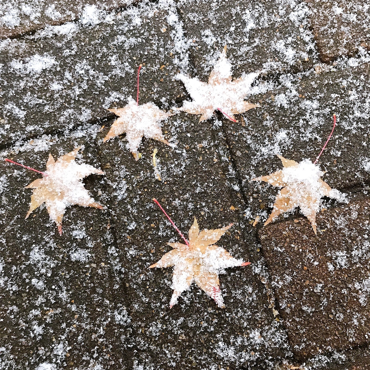 바닥에 떨어진 작은 단풍 위에 눈이 얹히니 땅에 박힌 별 같아서 신기하다.