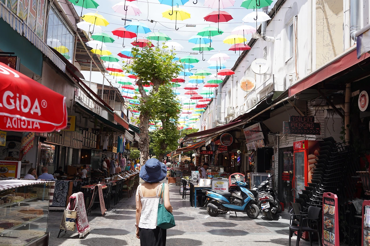 칼레이치 골목을 헤매다가 우산 거리(Umbrella Street)에 들어섰다. 우산 거리는 포르투갈 아구에다에서 시작되어 세계 여러 곳에 있다. 이스탄불에도 있었는데, 일부러 가보지는 않았다. 머리 위로 알록달록한 우산들이 매달려 있고, 햇살에 드리운 그림자가 바닥 위에서 춤을 춘다. 우산 그림자를 밟으며 걷기만 해도 재밌었다.