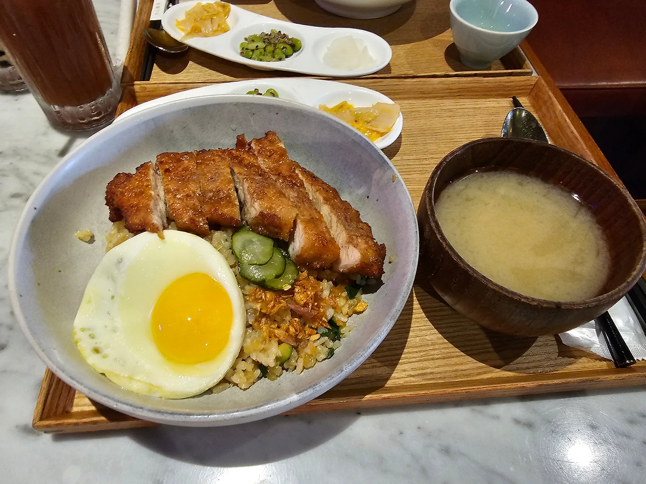식사는 돼지갈비 튀김 덮밥과 닭고기탕면