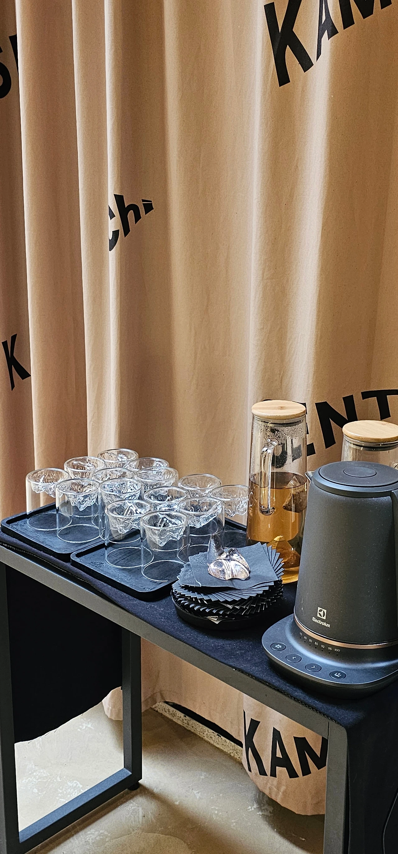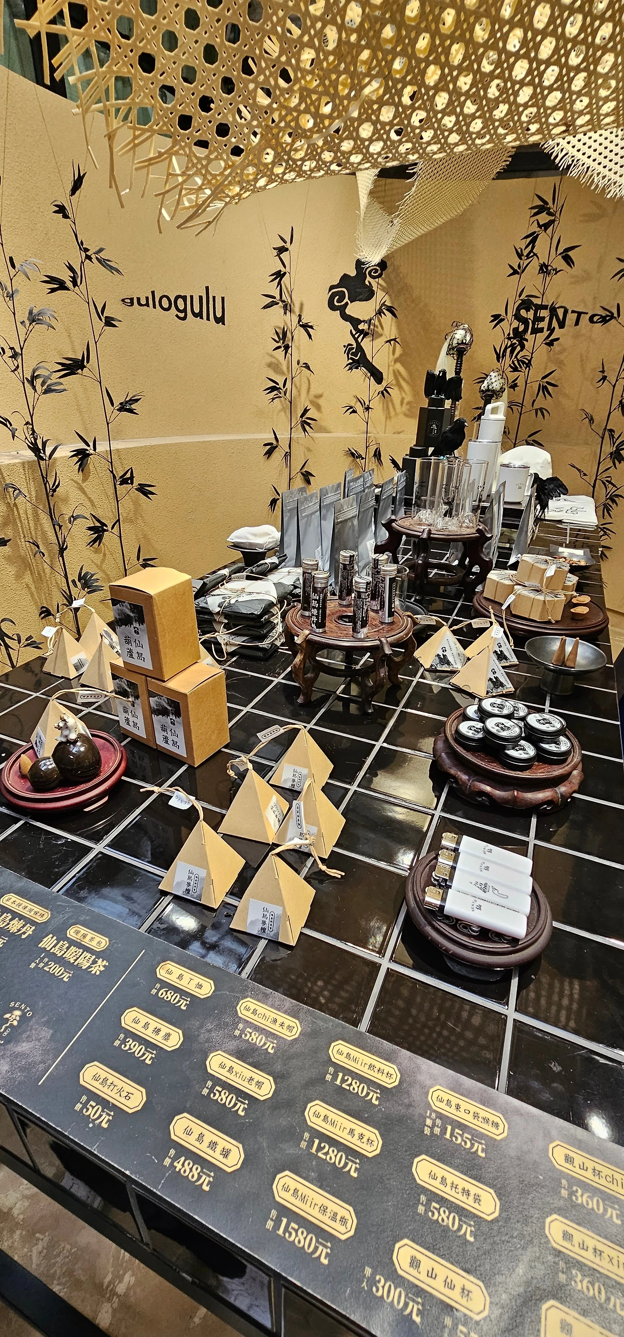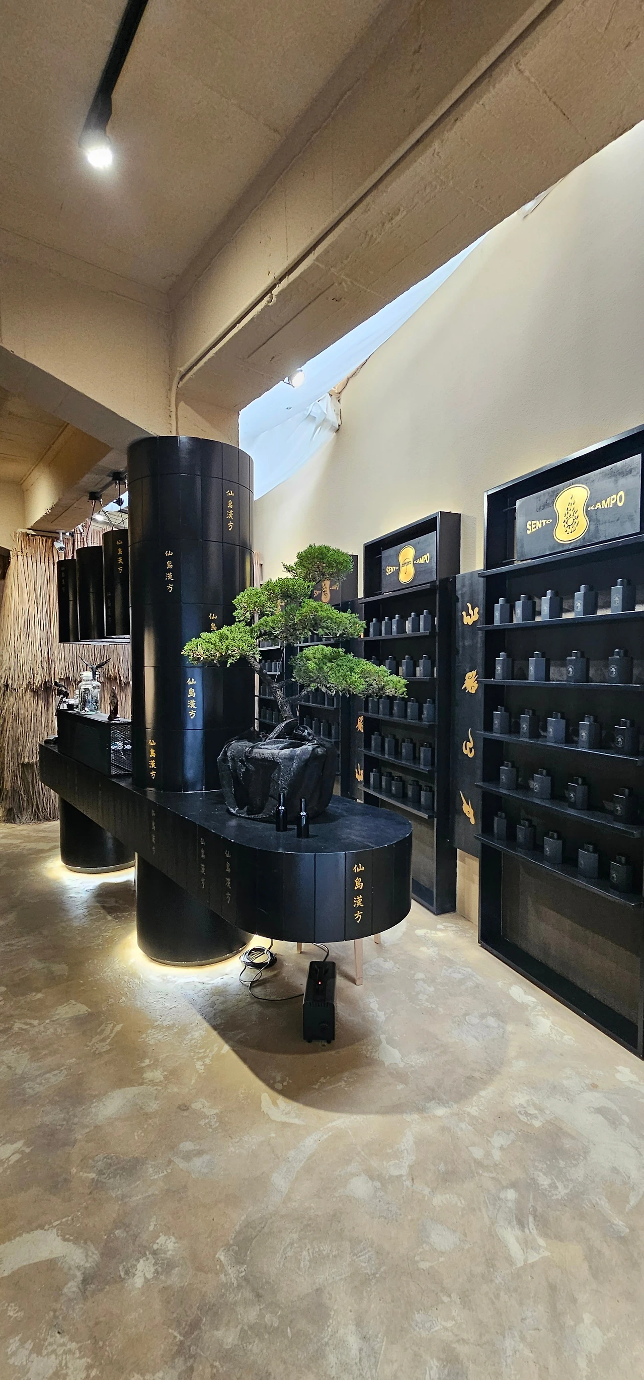 예약된 일시에 찻집을 방문하면, 오묘한 분위기와 에너지가 넘치듯 고요한 느낌의 실내가 등장한다. 검은색 발이 드리워 있는 안쪽의 긴 까만 테이블이 먼저 눈에 들어오고, 그 옆엔 뭔가 알 수 없는 소나무 분재가 있는 계산대(혹은 주문대)가 있다. 쿵푸옷인지, 태극권 스타일의 흑백 컬러 조합의 옷을 입은 스태프들의 안내를 받아 입장할 수 있다.