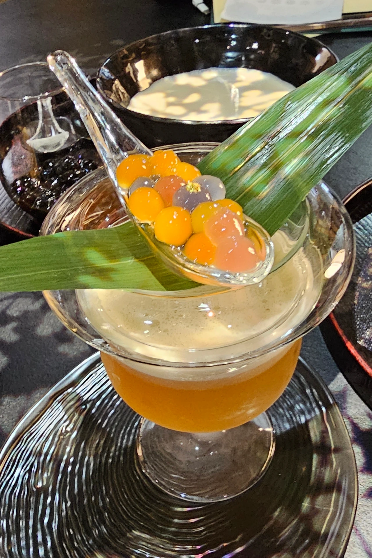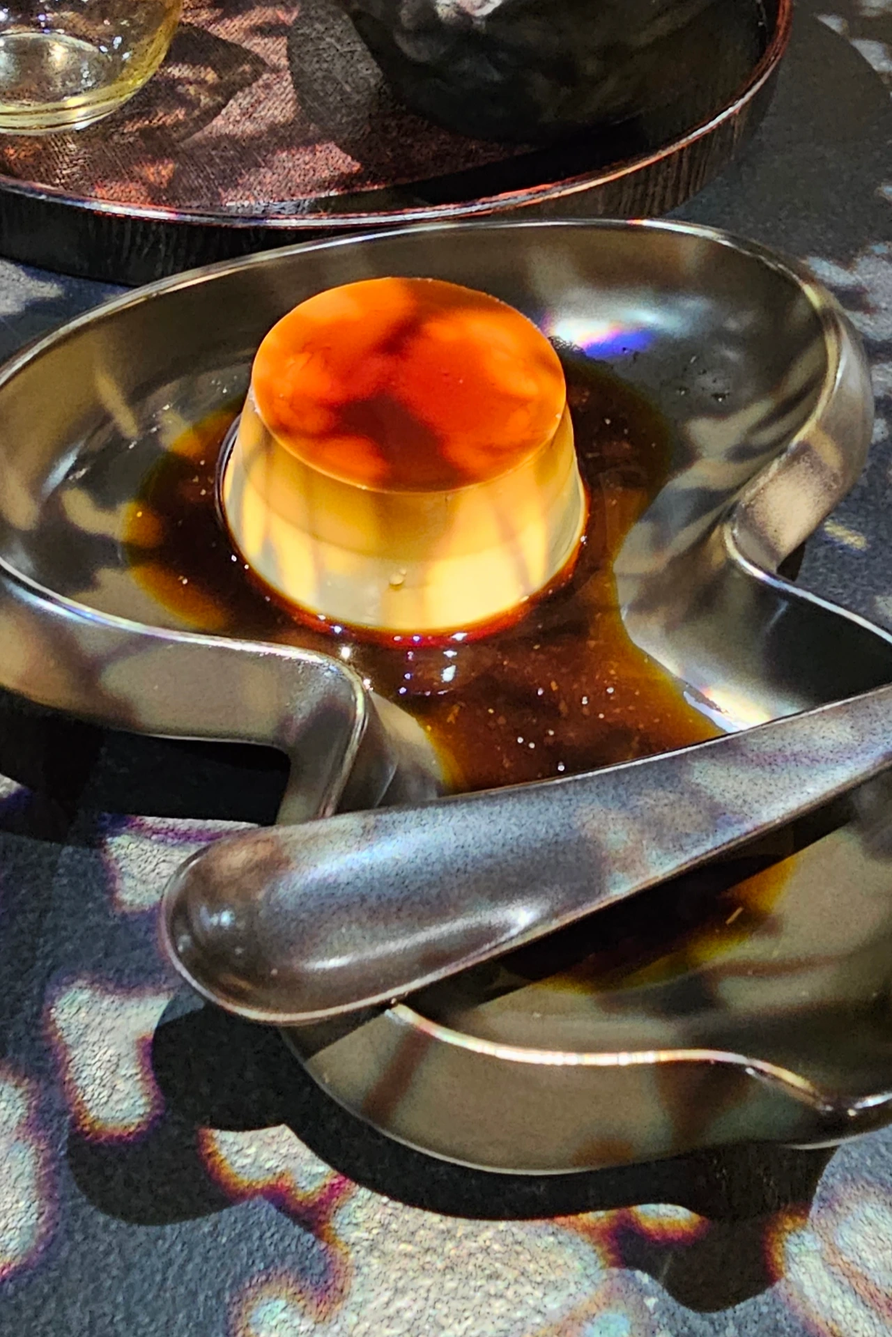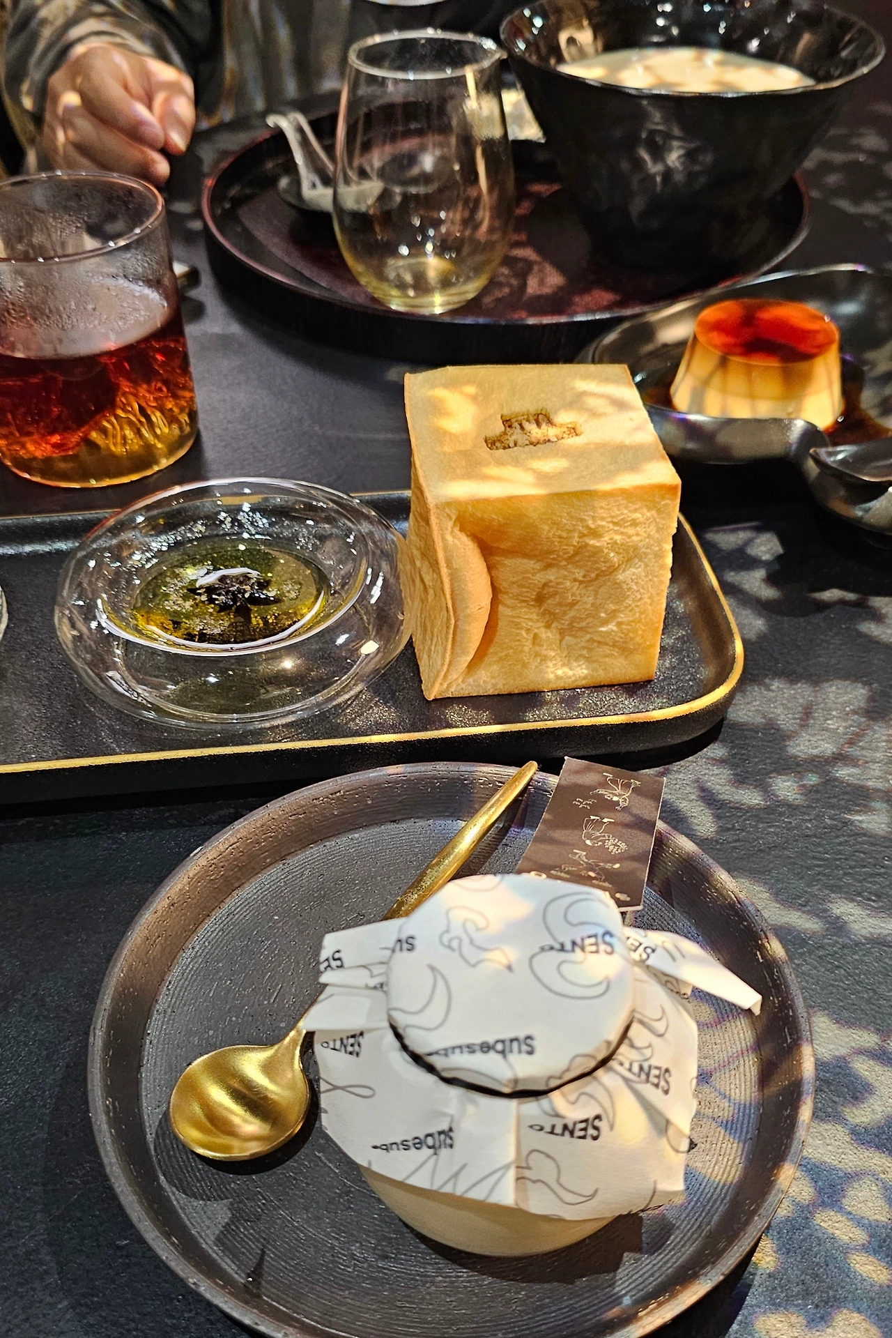 재미났던 디저트는 호리병 모양에 서빙된 푸딩과 와인잔에 담긴 검은 음료 푸딩. 와인잔에 담긴 푸딩은 대만에서 자주 먹는 선초 푸딩인 줄 알았는데, 카카오랑 위스키가 들어간 거라 해서.. 뭔가 싶고 그랬다. 왜 보리수 잎은 꽂아놓고 보리수 열매는 안 넣은 것인가 싶고.