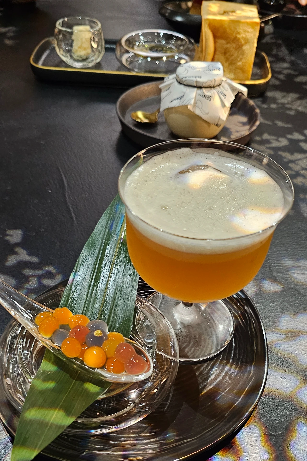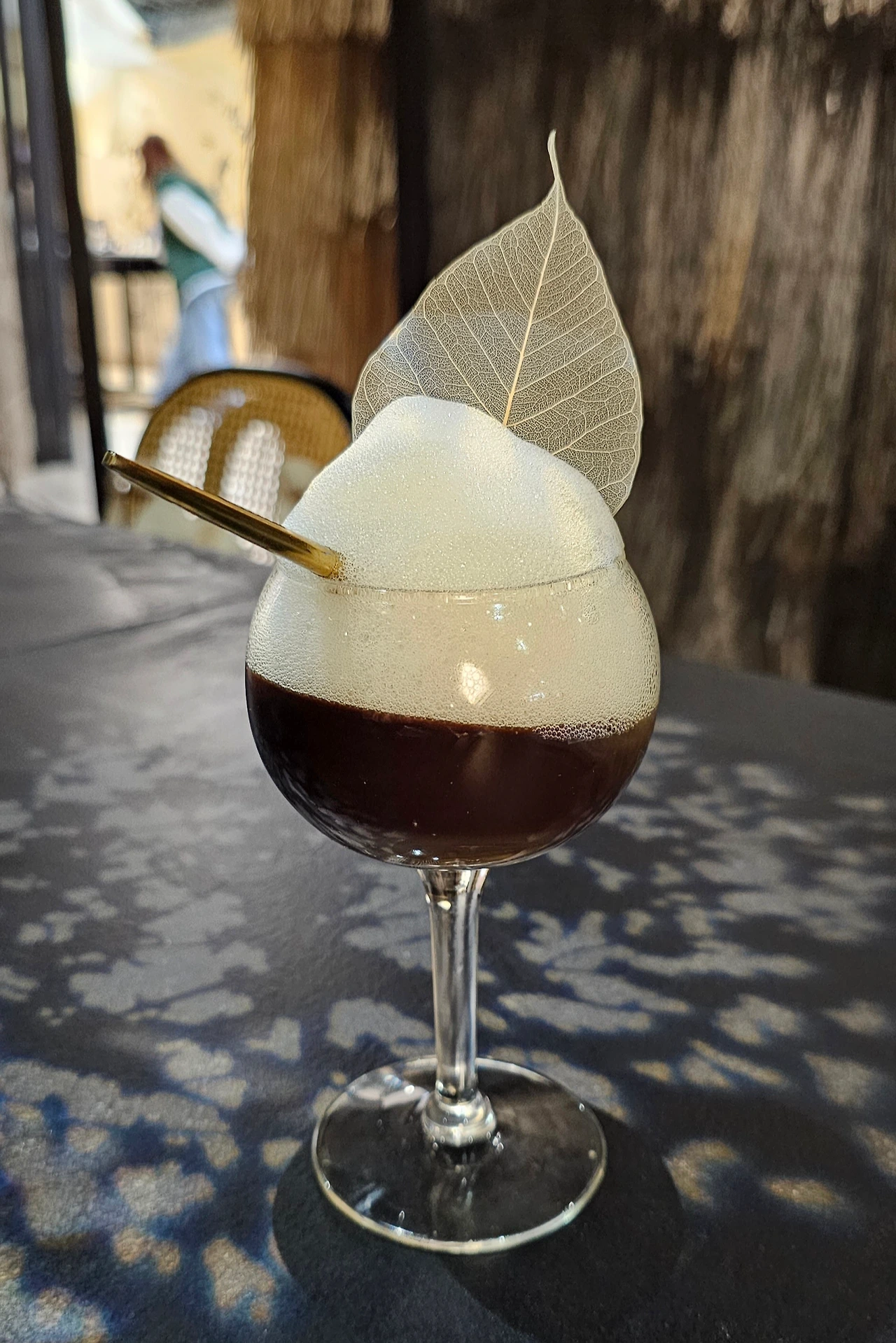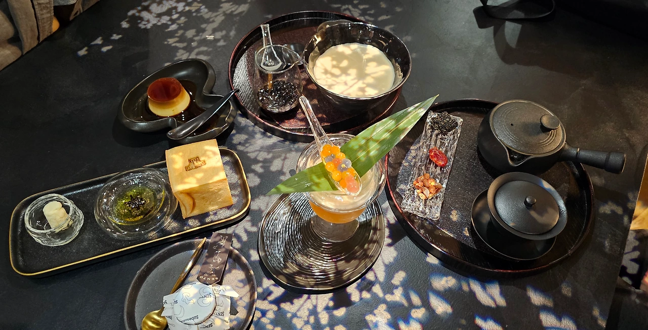 재미났던 디저트는 호리병 모양에 서빙된 푸딩과 와인잔에 담긴 검은 음료 푸딩. 와인잔에 담긴 푸딩은 대만에서 자주 먹는 선초 푸딩인 줄 알았는데, 카카오랑 위스키가 들어간 거라 해서.. 뭔가 싶고 그랬다. 왜 보리수 잎은 꽂아놓고 보리수 열매는 안 넣은 것인가 싶고.