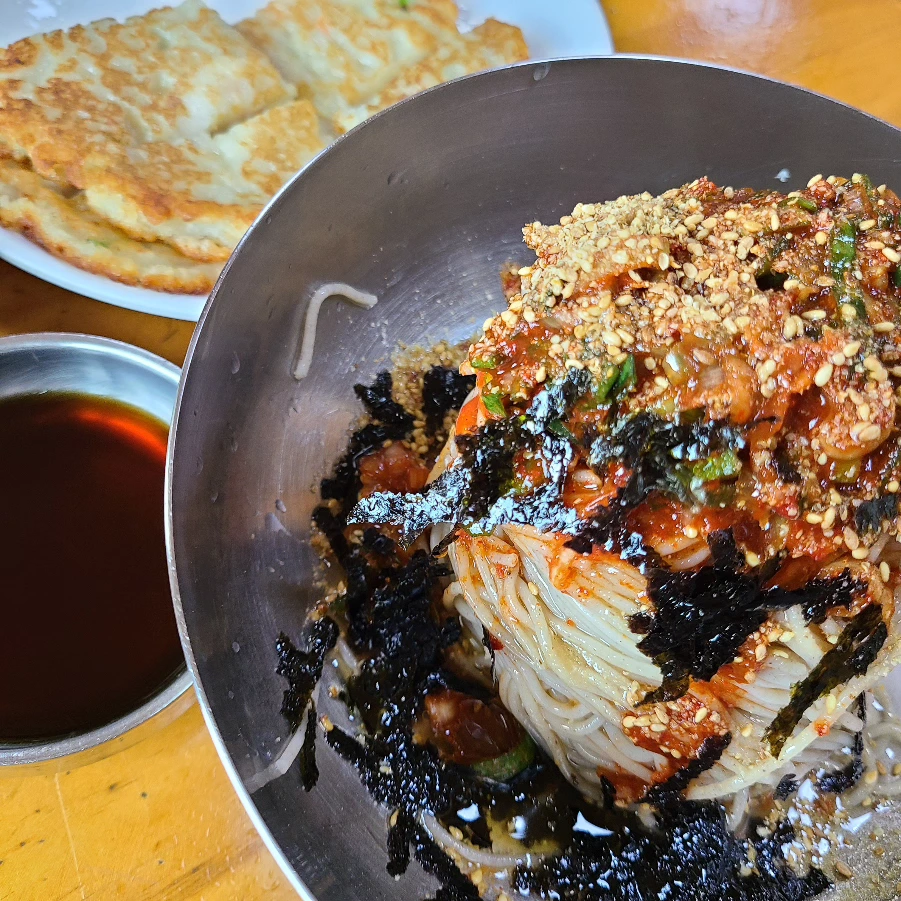 강원도에 왔으니 막국수지. 앗, 테이블마다 올려져 있는 감자부침도 먹어 주어야지. 메밀전병도 녹두부침도 맛있겠다. 막국수에는 실은 편육인데. 막걸리를 시키지 않은 건 왕복 운전하는 사람을 위한 나의 마지막 의리로다.