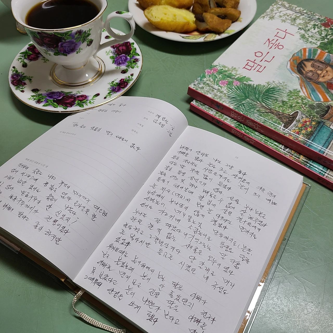 꽃무늬 커피잔, 시장표 도넛, 깔개, 그리고 두 권의 책
