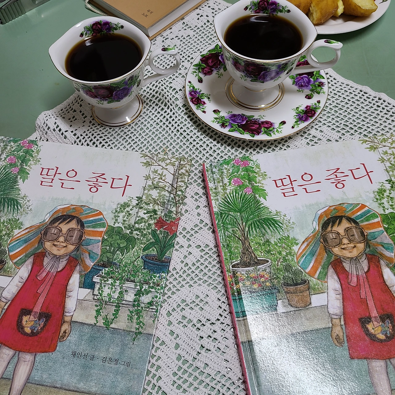 반찬 만들었으니 가지러 오라고 해서 들른 평일 오후. 바로 일어서려는데, 사 온 도넛을 먹고 가라 한다. 온 김에 책 사진 찍어야겠다. 엄마, 예쁜 커피잔 없어? 넌 참 유난이다 하면서, 이여사는 꽃무늬 커피잔을 꺼내 온다. 바닥에 뭘 좀 깔고 찍으라며 손수 뜬 깔개를 펼쳐 든다.