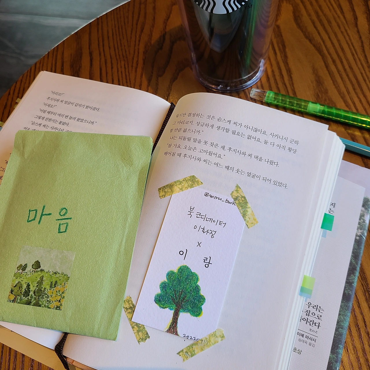 끼워져 있던 연둣빛 봉투에는 초록색 글씨로 '마음'이라고 쓰여 있었다. 빨강 노랑 파랑으로만 만든 나무 그림도 함께 있었다. 20220917 날짜를 가만히 쓰다듬었다. 나는 그날 한없이 쪼그라든 마음으로 그곳을 향했었다. 초록색 두꺼운 책 이야기를 들으며 나누며 낭독하며 덜컹이던 마음이 천천히 부드러워짐을 느꼈다. 헤어지는 길 두 팔 가득 나를 안아주는 어느 포옹 하나에 눈물이 왈칵 쏟아졌더랬다. 어느 도서관 옥상에서의 여름밤이 오래 그곳에 남아 있었다.