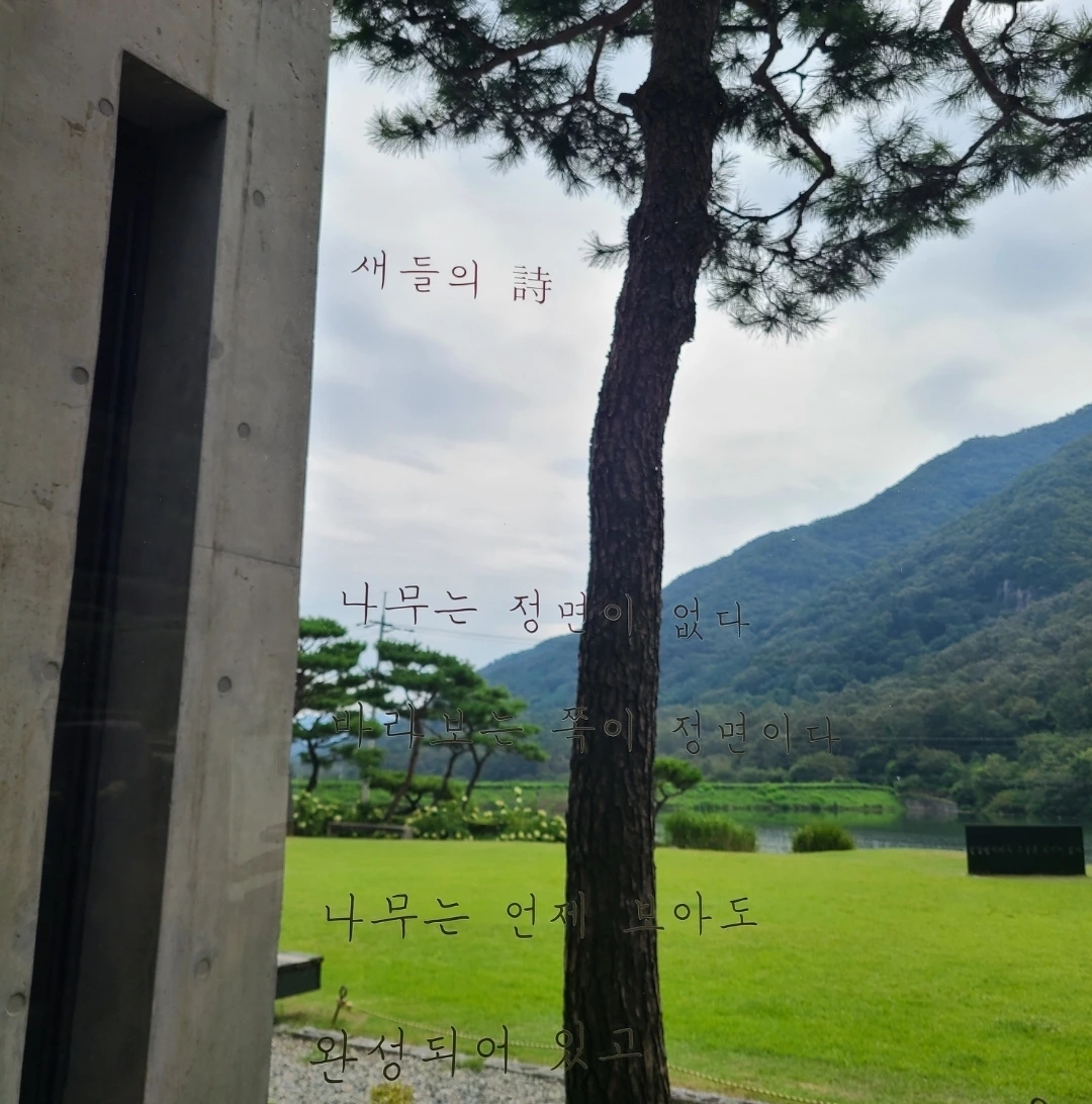 초록 잔디 위에는 '민달팽이에게 도달은 의미가 없다'라고 쓰여 있었다. 카페의 유리창에는 '새들의 詩'라는 글이 쓰여 있었다. 같은 시간과 공간을 보낸 이들의 눈길을 받으며 쑥스럽지만 팔짱을 꼈다.