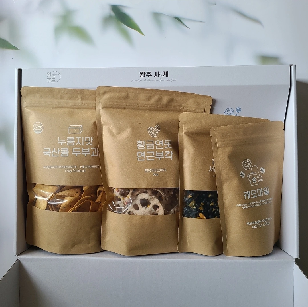 빨래를 돌리고 남매에게 설거지를 시키고 짐을 정리했다. 남편이 건네는 상자를 조심조심 열었다. 두부과자, 서리태 뻥튀기, 연근부각, 캐모마일 티백.. 완주에서의 추억들이 새록새록 담겨 있었다.