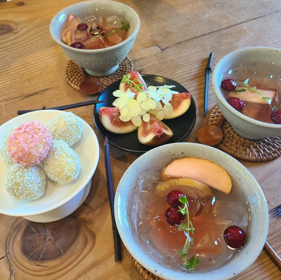 전주역으로 마중 나온 이가 건넨 약과 한 개를. 이름도 맛도 다정하던 수제 돈까스와 필라프를. 취향 저격 웰컴티 한 잔과 국산 콩으로 만든 보글보글 순두부를. 향긋한 아침 커피와 달콤한 저녁 와인을. 매일 먹어도 좋을 법한 부드럽고 고소한 누룽지와 정갈한 8첩 반상을. 사과차와 한과와 무화과를. 직접 딴 알밤과 직접 말린 천일홍꽃을. 불맛 나는 주꾸미볶음과 ASMR 최강자 파전과 막걸리 한 잔을. 극진한 대접이고 환대이고 호사였음을.