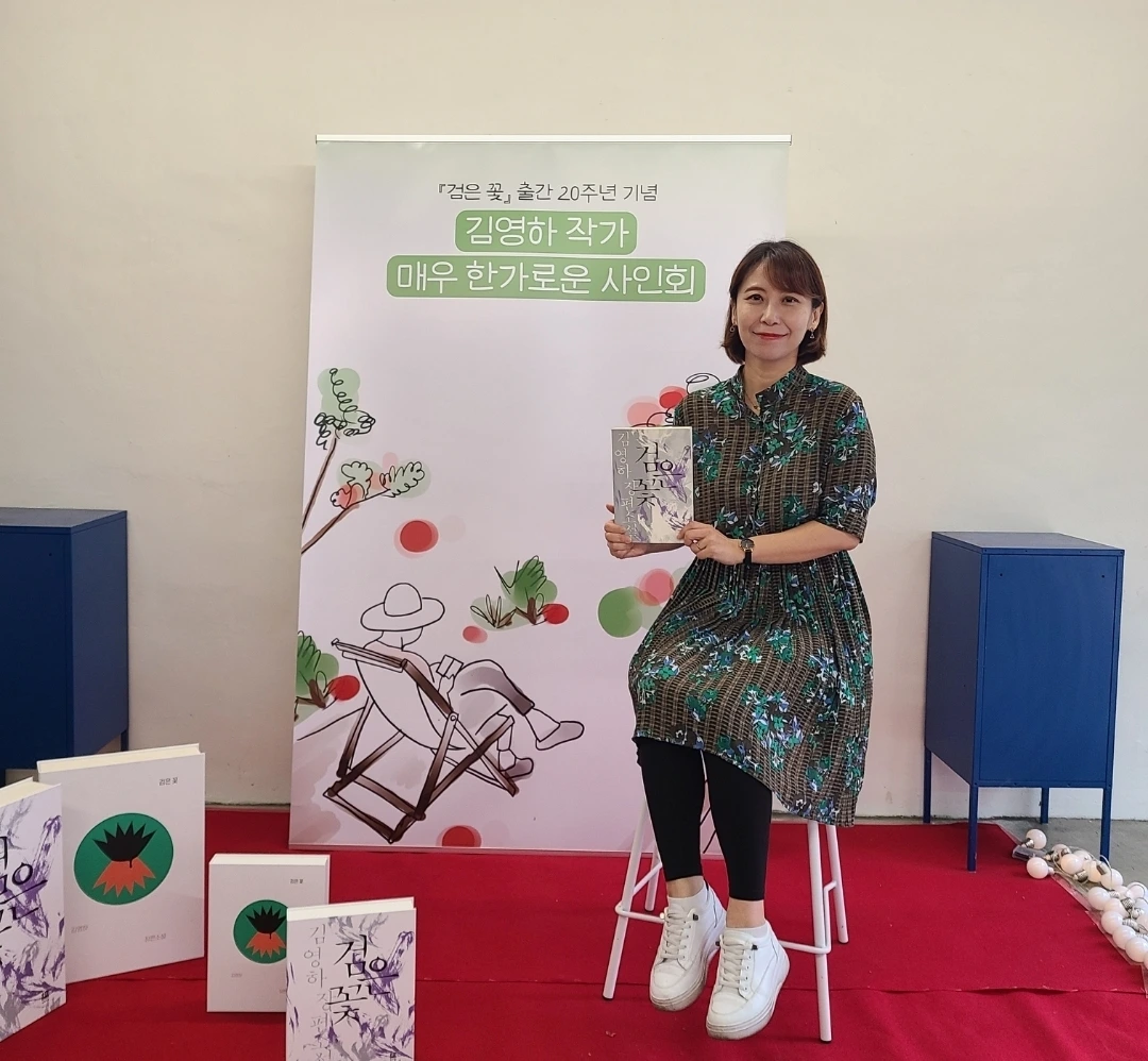 작년 국제 도서전에서 뵈었을 때보다 조금 더 많아진 흰머리와 조금 더 두꺼워진 옷차림과 조금 더 주름진 미소의 여유로움을. 정원도 창문도 책상도 빗소리도 출간 20주년 축하하는 핑크 반짝이도 찰떡같이 어울리던 장소를. ‘지그시’ ‘그윽하게’라는 부사를 구현해 내는 그의 환대를 두 번이나 받는 것은 복(福)이라는 두 번이나 반복한 장소이기에 가능했다는 것을. 빗소리를 맞으며 주름진 미소가 익숙한 ‘나의 그’를 만나러 가는 길, 검은 꽃이 아닌 가을꽃 같은 우리의 순간이 피어나고 있었음을.