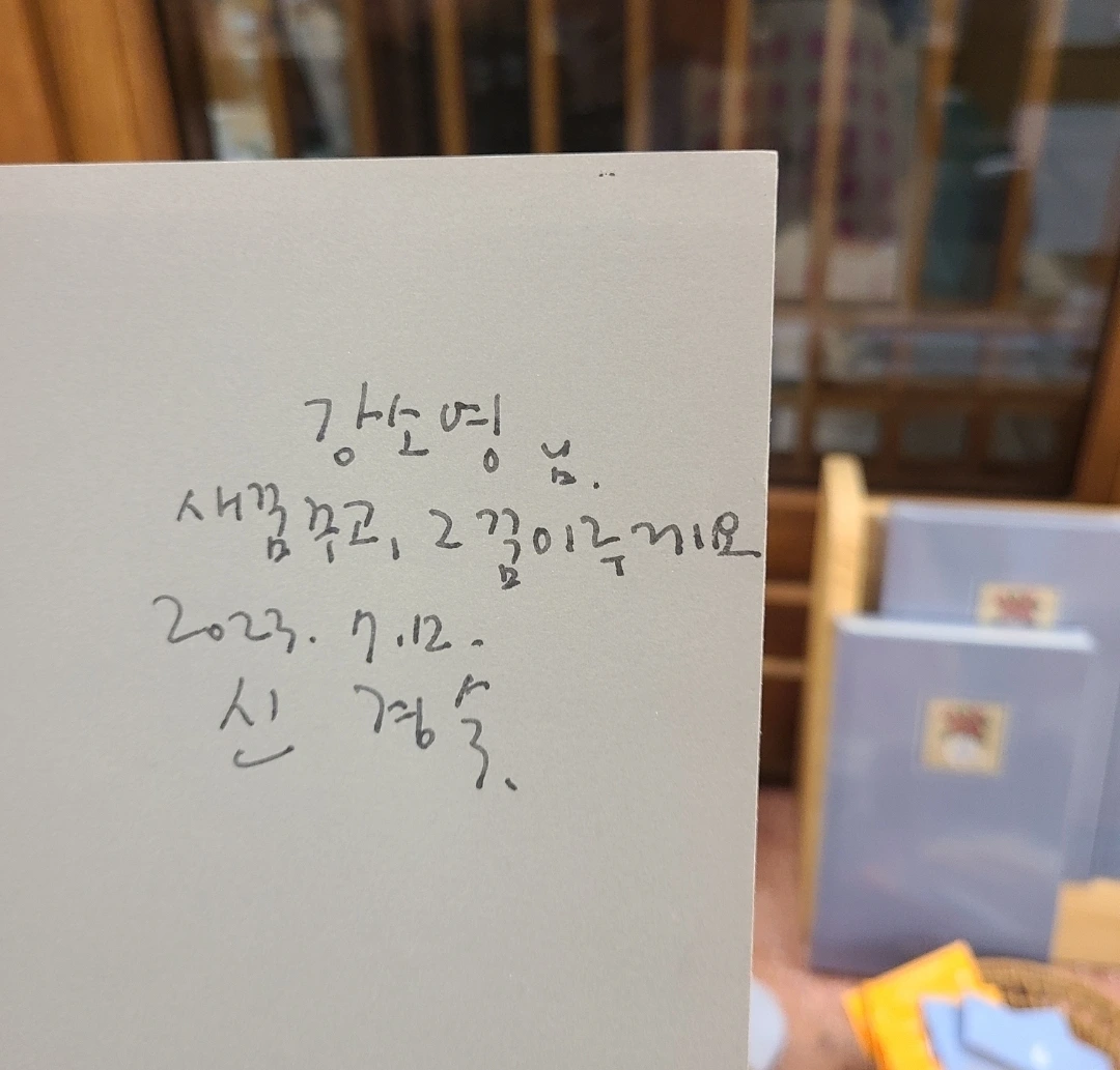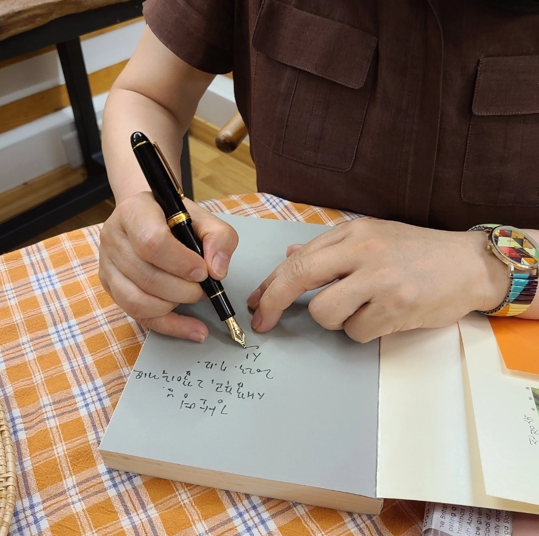 행사 후 책에 사인을 받는 시간이 되었다. “친정엄마와 시어머니와 시누이와 함께 책을 읽는다니, 너무 보기 좋네요. 앞으로도 좋은 시간 나누시길 마음으로 응원하겠습니다.”엄마는 책을 쓴 작가를 만나는 게 처음이라며 살며시 웃으셨다. 어머님과 아가씨에게 선물할 책에 사인을 받았다. 나란히 마주 서 사진도 찍었다.