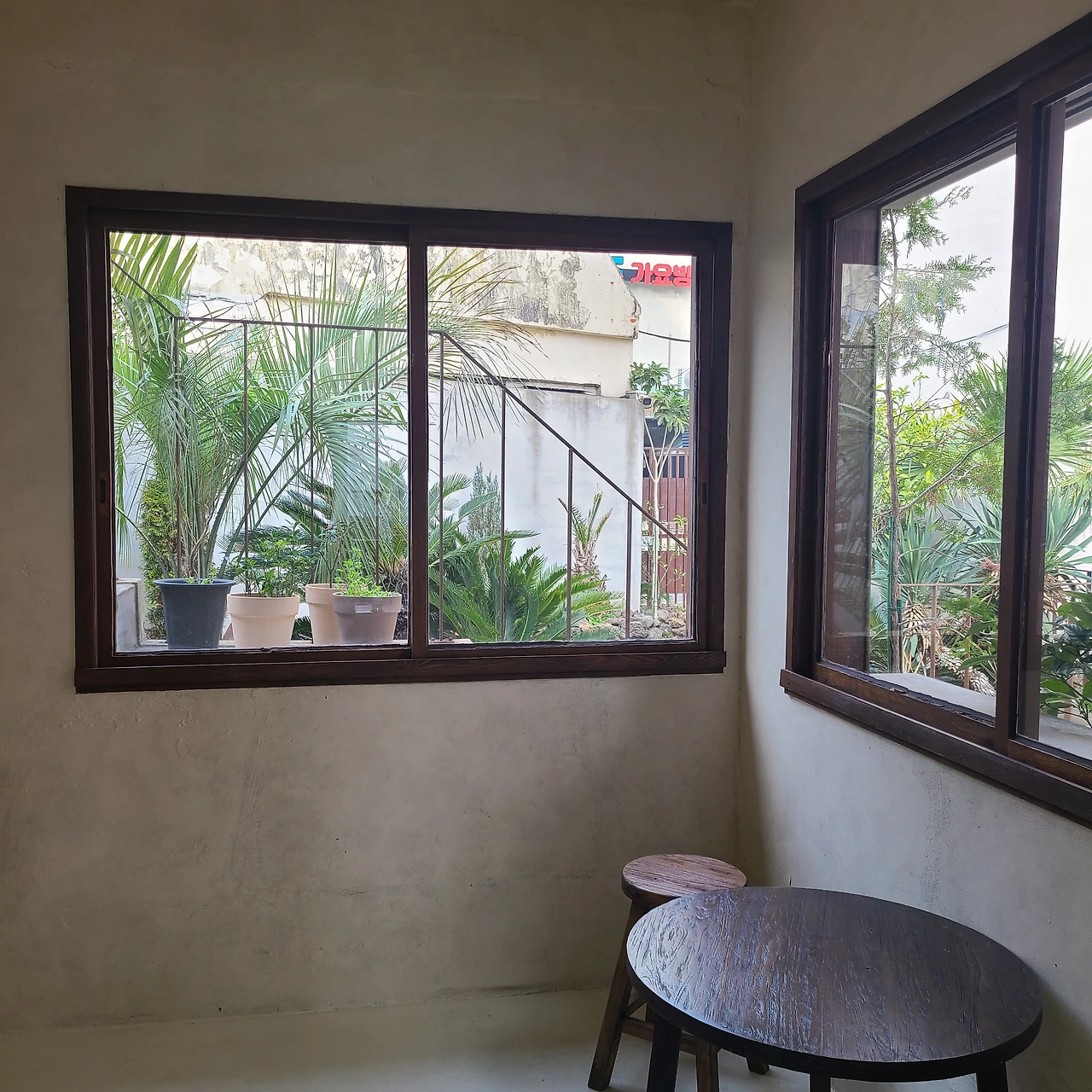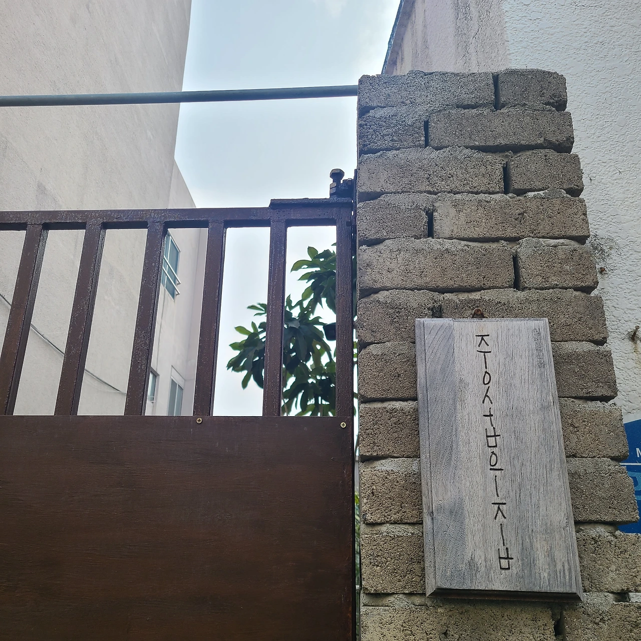 심심하고 단조로운 도로들과는 달리 일반 시내 같은 길에 맞게 가고 있나 싶었다. 한산한 거리에 들어서자 익숙한 그림들이 벽에도 길바닥 위에도 보이기 시작했다. 주차를 하고 카페를 찾는 길. 일반집 대문처럼 생겼고 간판이 작고 입구의 초인종을 눌러야 문을 열어준다는 후기를 기억해 놓길 잘했다. 어두운 나무색 철문 옆으로 가지런히 쌓인 벽돌 위에 회색빛 간판에 새겨진 'ㅈ ㅜ ㅇ ㅅ ㅓ ㅂ ㅇ ㅡ ㅣ ㅈ ㅣ ㅂ' 옳게 찾아왔구나. '삐!' 초인종을 눌렀고 '철컥!' 문이 열렸다.