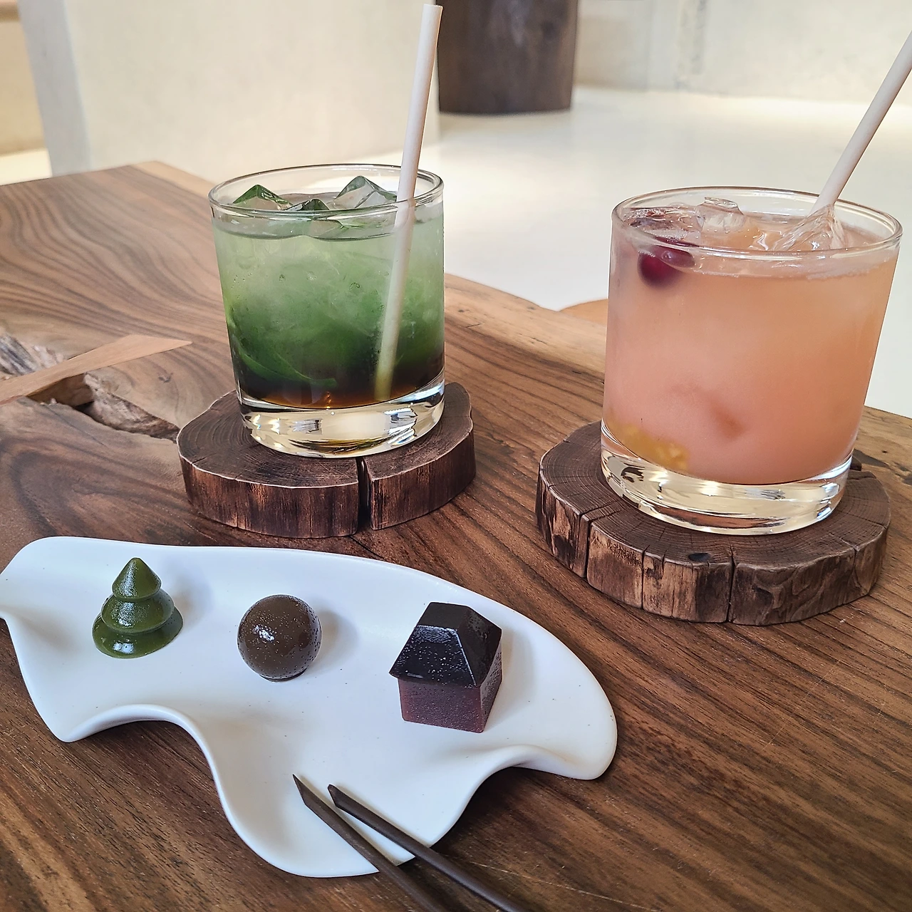 아껴놓은 오늘치 커피를 마실까 하다가 자주 올 수 없는 곳인 만큼 예쁜 사진 찍기가 카페인 수혈을 이겼다. 시그니처 메뉴 서귀포의 환상, 섶섬이 보이는 풍경, 집양갱을 주문했다. 음료의 이름은 이중섭의 작품명이라는 것을 처음 알았다. 작품을 검색해 보는 동안 한라봉과 열대과일로 만든 연주홍빛 음료와, 매실청과 바질 등 초록의 맛이 느껴지는 음료가 도착했다. 동그랗고 네모지고 트리 모양의 작고 귀여운 양갱 3 총사는 팥 호지 말차 등 제주의 맛이 담겨 있다고 했다. 나뭇가지 같은 포크를 이용해 작게 잘라 한 입씩 사이좋게 먹었다. 집양갱은 달디달고 달디달지는 않았다. 우리 집 미슐랭이 말했다. "음, 맛있네."