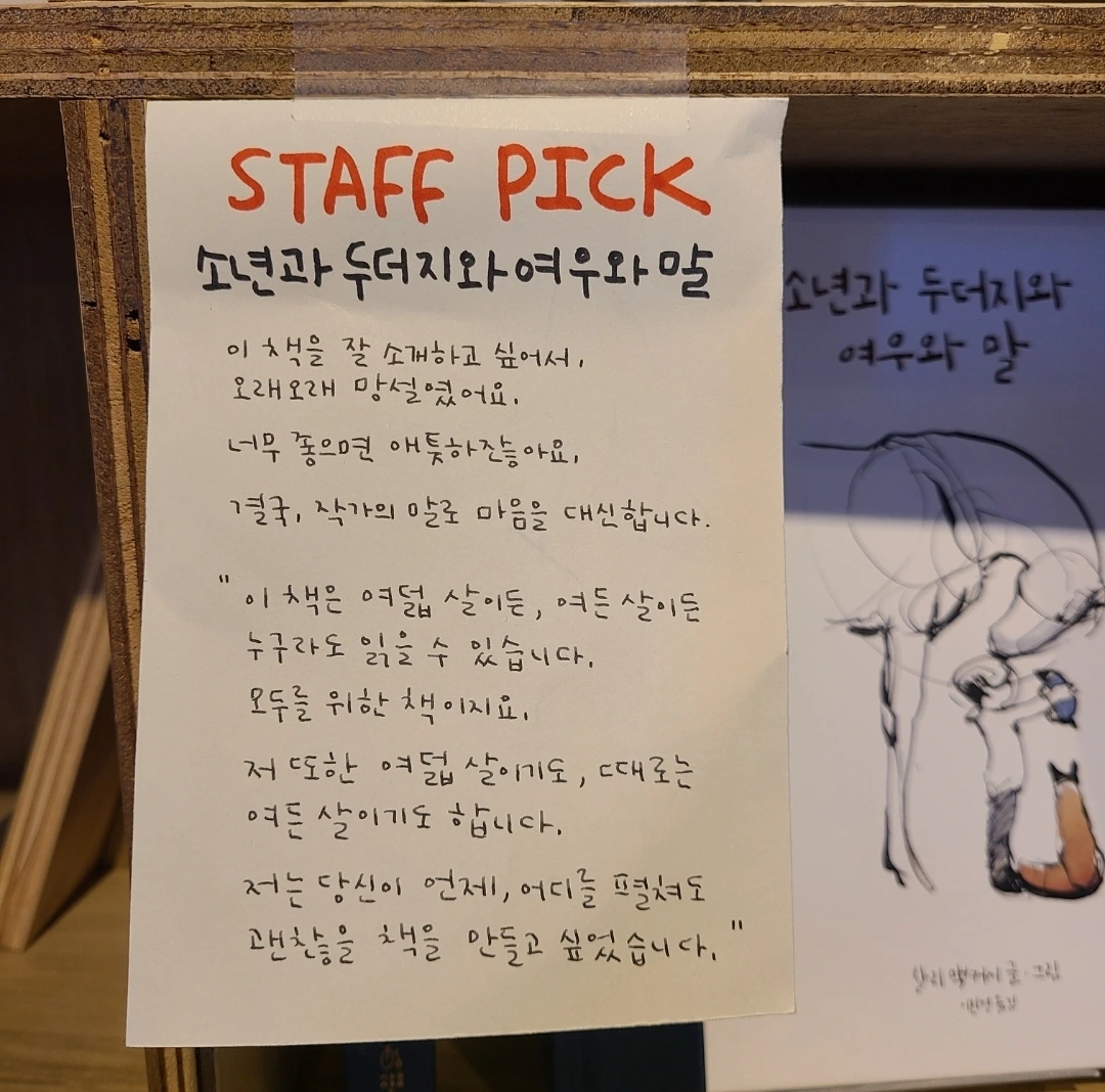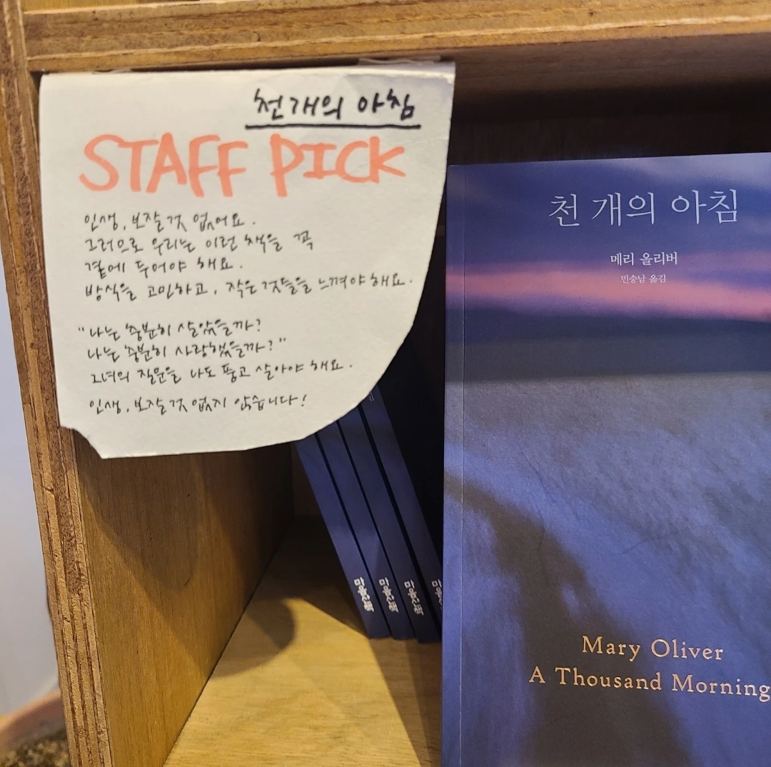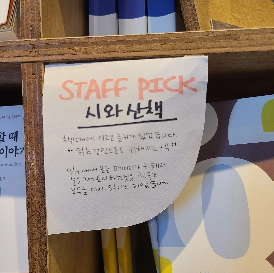 푸릇푸릇 봄이 보이는 창 안쪽으로 세심한 배려들이 가득했다. 숨겨둔 책을 돋보기로 자세자세 살펴보고 책방지기의 큐레이션을 가만가만 읽었다. 읽은 책은 아는 얼굴을 만난 듯 반가웠고 안 읽은 책에는 덜컥 호기심이 일었다. 독서모임에서 읽었던 책들은 멤버분들에게 공유하고 싶어 일부러 폰에 담았다. 아는 척을 하고 싶어서 책을 읽기 시작했는데, 아는 책들을 만나는 우연은 농도 짙은 즐거움이었다.