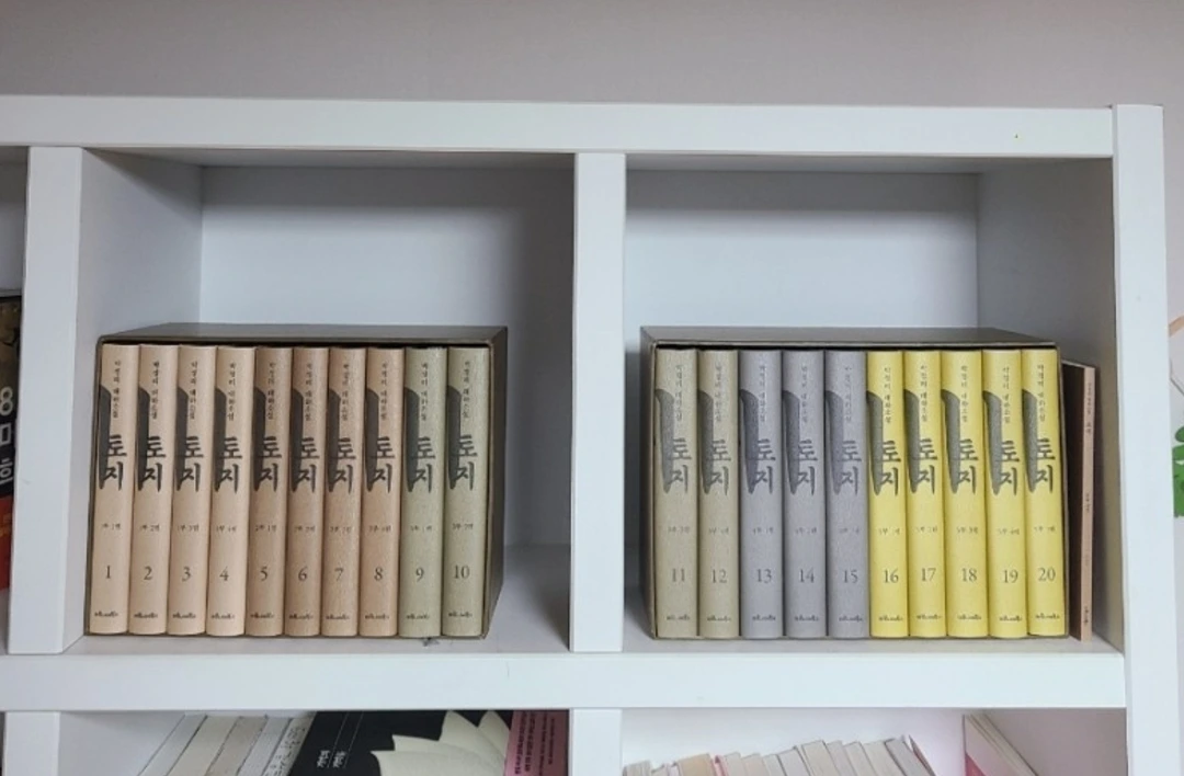 고민은 신중히 결정은 신속히. 드디어 토지 전권을 구매했습니다. 큰맘 먹고 책장 정리를 한 건 토지 스무 권의 자리 확보를 위한 큰 그림이었을 겁니다. 가장 놓은 곳에 모셔놓고 보니 몹시 든든하기만 합니다. 남매에게 물려줄 한 뙈기 땅은 없지마는, 박경리 작가님의 '토지' 스무 권은 물려줄 수 있게 되었습니다 그려. 하하.