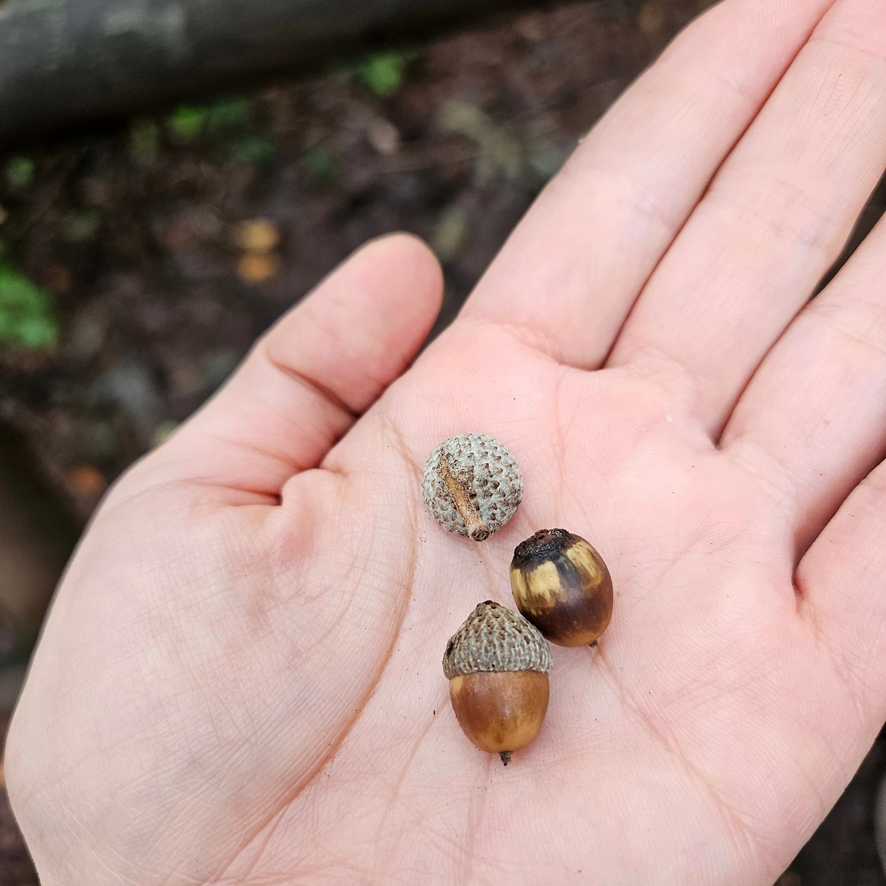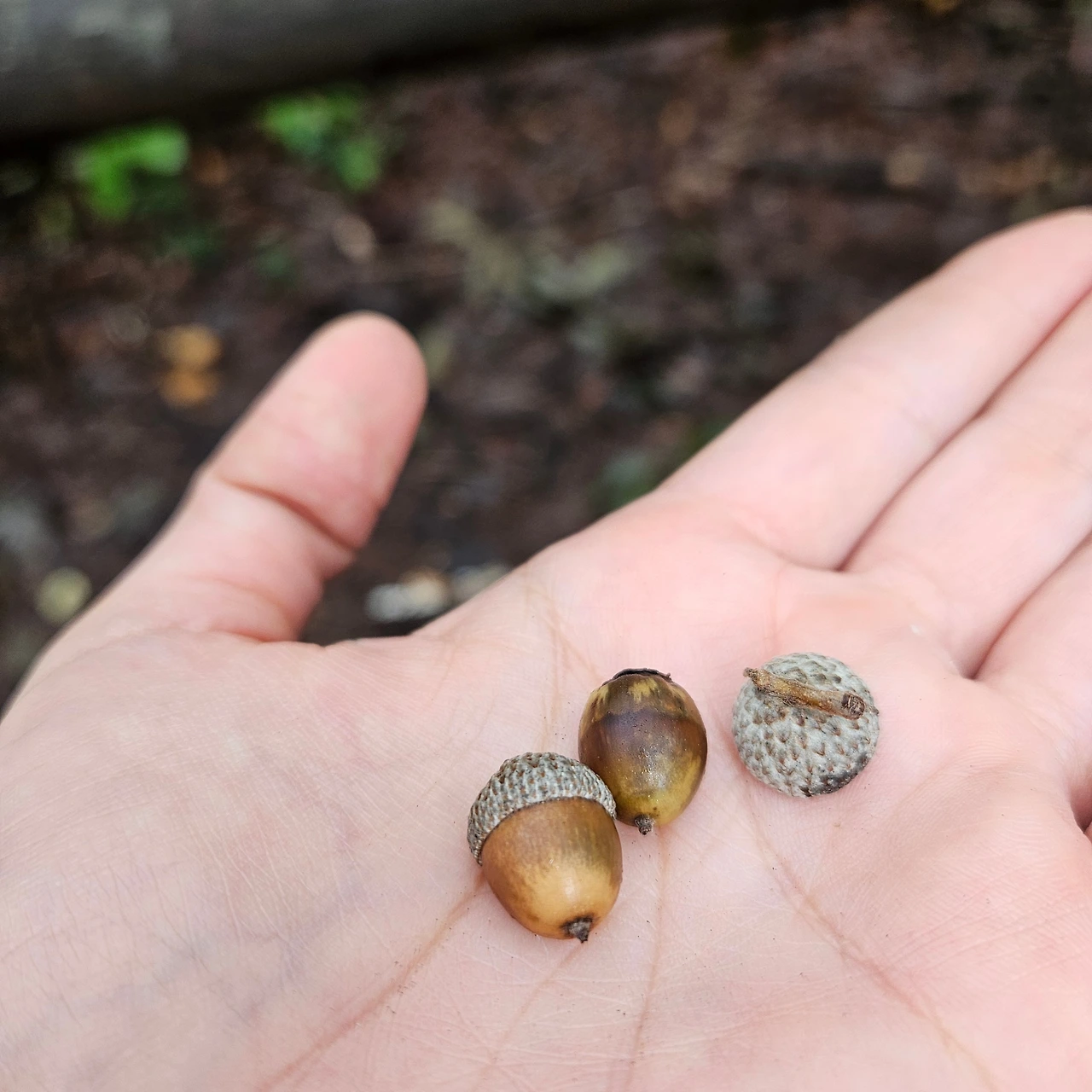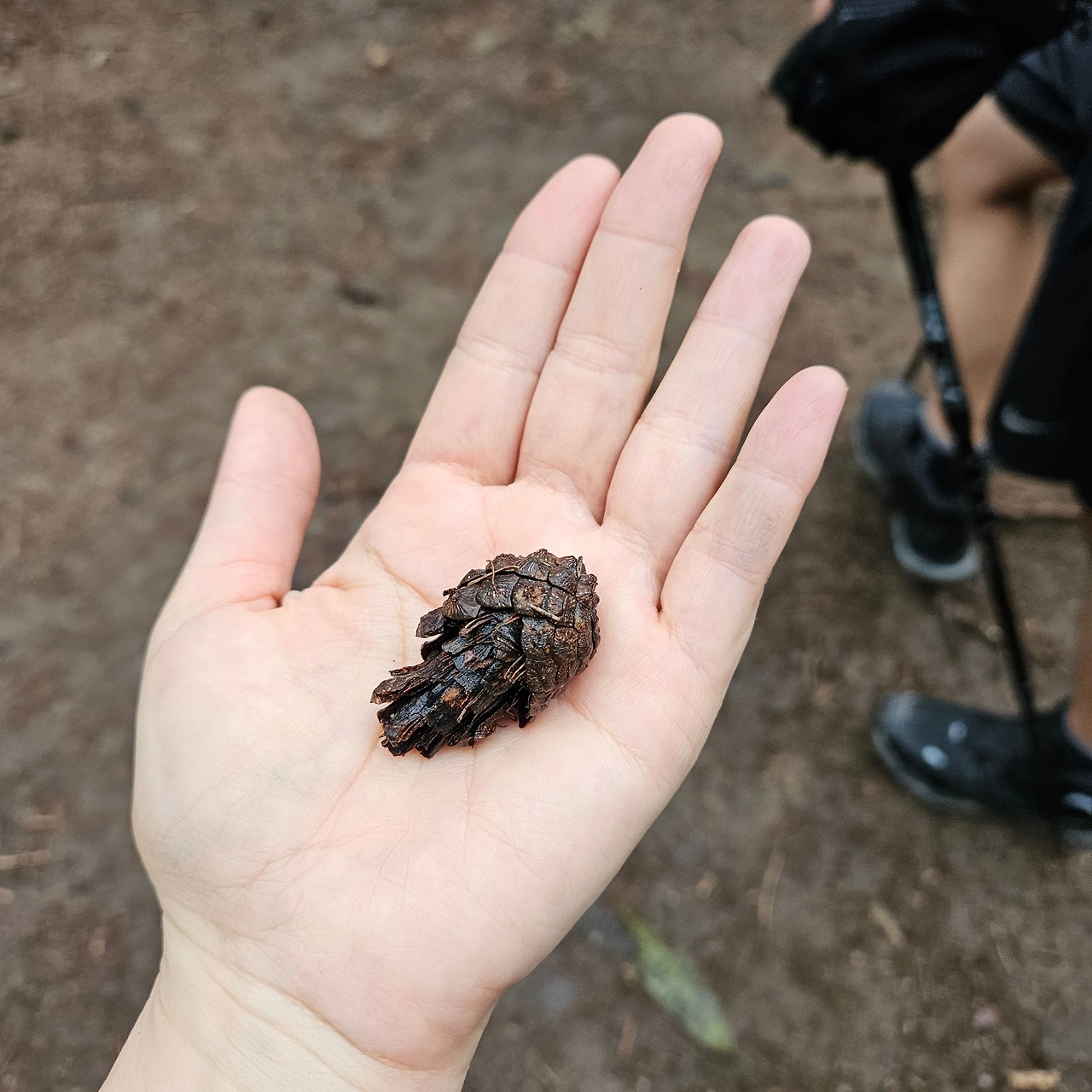다람쥐와 청설모들이 발라 먹고 버린 잣송이나 솔방울 모양이 꼭 새우튀김 같이 생겼다고 책에서 그랬는데. 두 남자를 앞세워 새우튀김 찾기 미션을 시행할 때만 해도 괜찮았다. '도토리나무'가 있는 게 아니라 몇몇 나무의 열매를 다 도토리라고 한대. 어떤 나무일까요? 퀴즈를 낼 때만 해도 즐겁기만 했다. (정답은 잠시 후에 공개) 계곡이 마치자마자 이어지는 경사, 불안정한 밧줄, 전날 내린 비바람이 떨어뜨린 나뭇가지나 이파리들이 내내 미끄덩거렸다. 새우튀김도 도토리도 눈에 들어올 틈이 없었다. 모처럼 만난 초가을 산이 뿜는 내음을 맡을 겨를도 없었다.