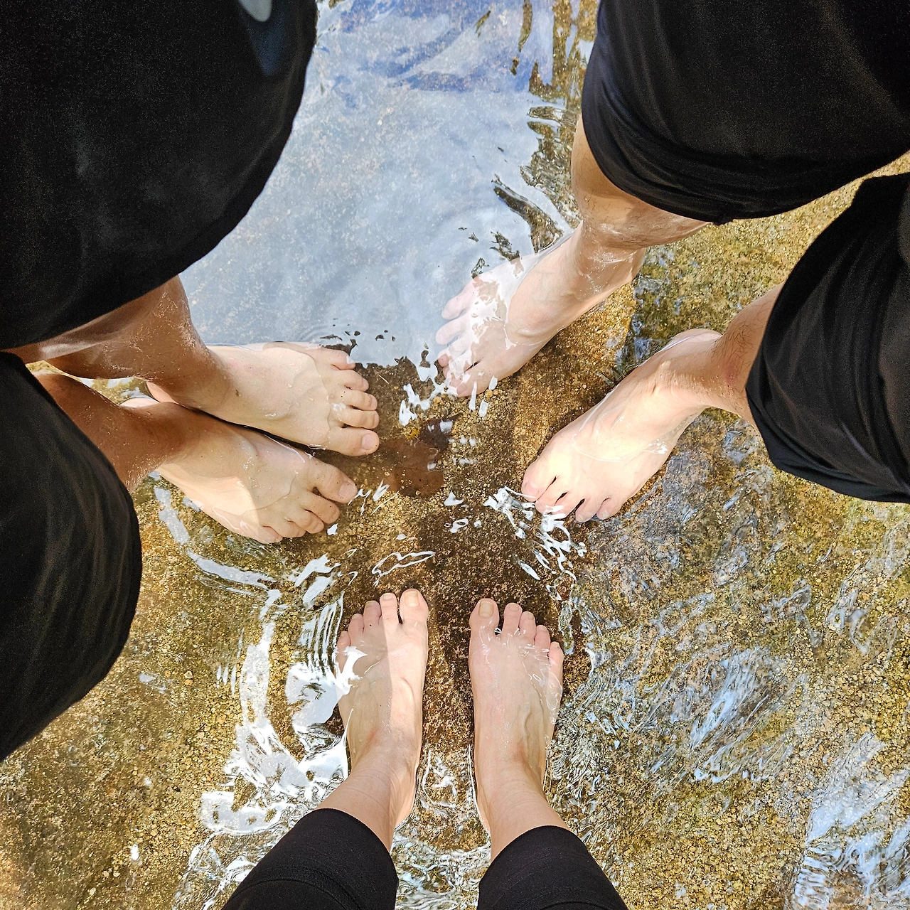 두 남자는 등산화와 양말을 벗고 물로 향했다. 짜릿한 시원함에 한 번, 가시는 피로감에 또 한번 즐거운 비명을 질러댔다. 머리를 들이밀고 세수를 하며 행복해했다. 햇살에 반짝이는 얼굴들에 보고 있는 나조차 기분이 좋아졌다. 흐르는 물에 후끈거리던 발을 담그니 힘이 나는 것도 같았다.