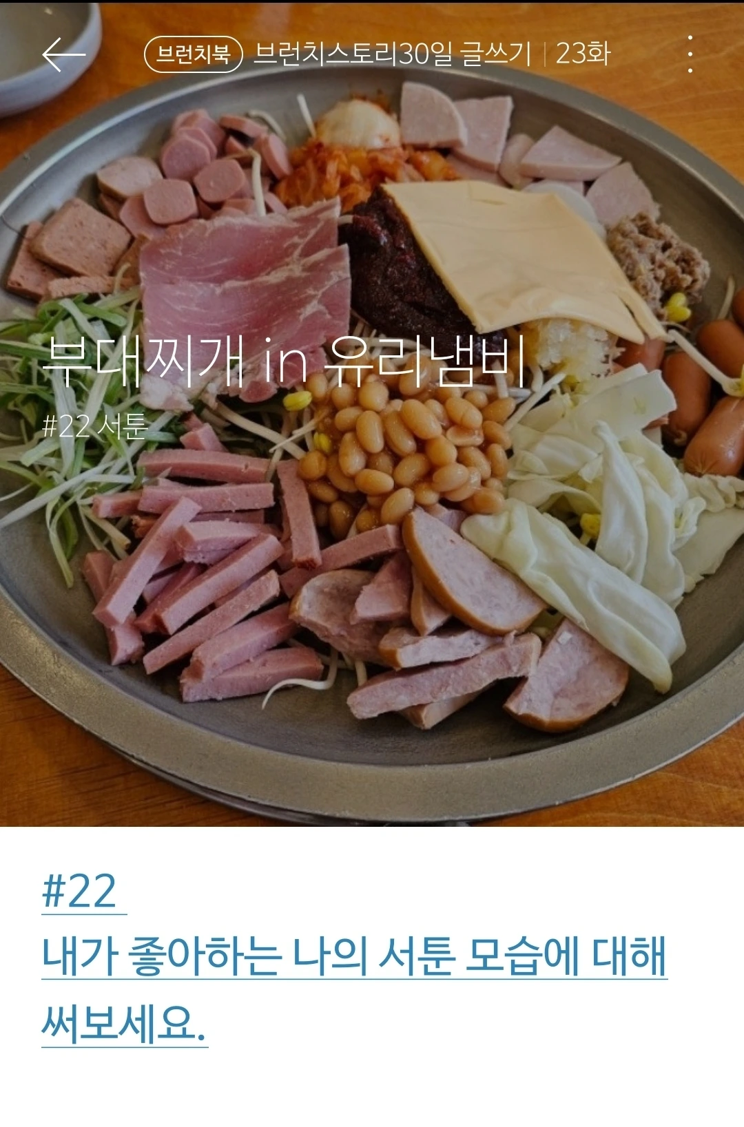 11월 한 달 동안 진행했던 30일의 글쓰기가 막바지에 접어들었다. 30개의 글감으로 네 명이 글을 쓰고 공유해 서로의 글에 하트와 덧글을 달아주는 일은, 쉽지 않았지만 쉼이 되어 주었다. 11월 22일의 글감은 '서툰'으로, 내가 좋아하는 나의 서툰 모습에 대한 글을 쓰는 것이었다. 유리 냄비에 끓인 부대찌개 이야기로 글쓰기 과제를 제출했다.
