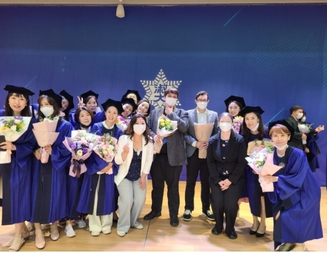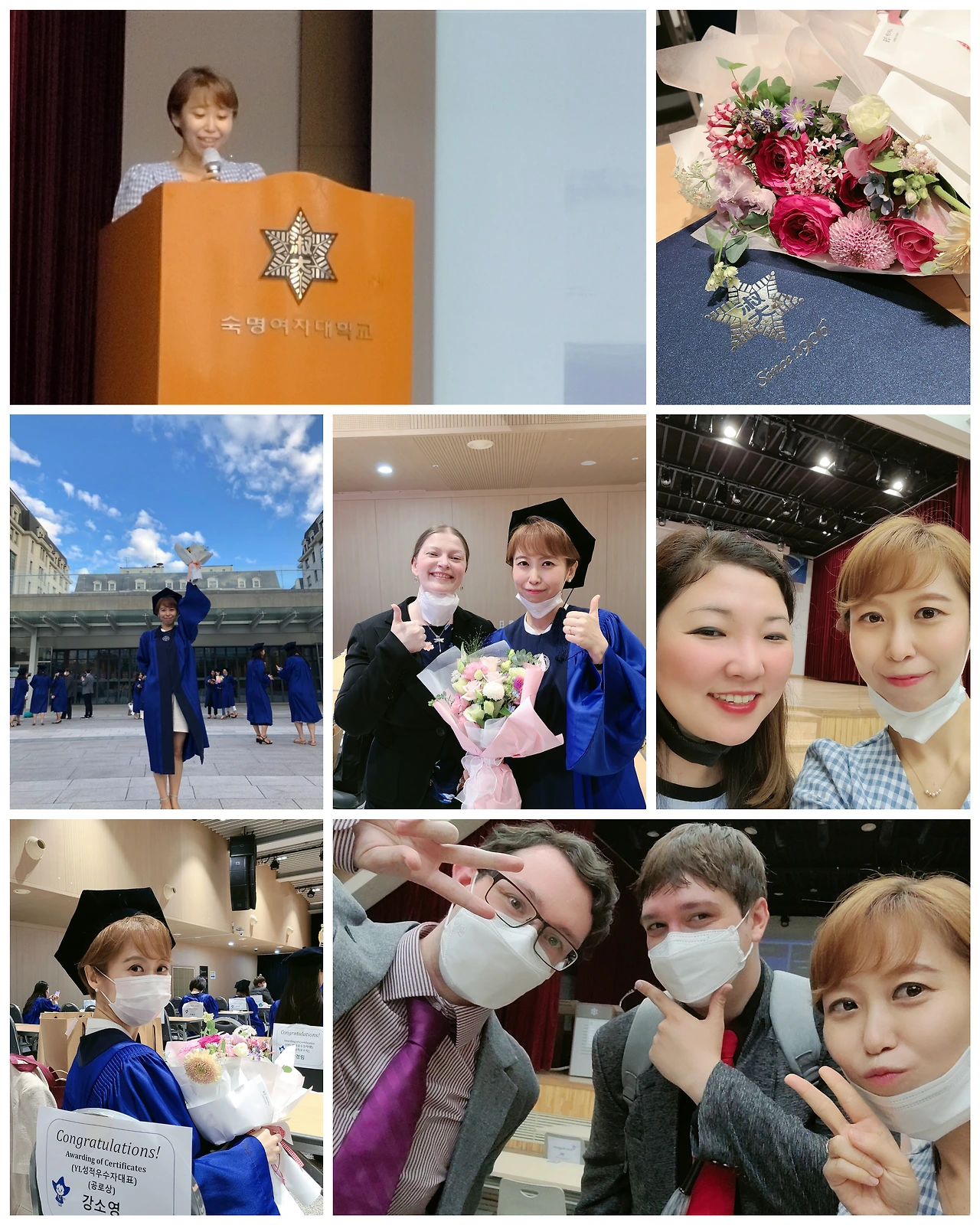 20주의 과정을 마치고 파란색 졸업 가운과 학사모를 착용했다. 마스크를 쓰고 만나 축하와 응원을 주고받고 꽃다발과 한 잔을 나누었다. 다시 못 올 값진 경험의 끝이었다.