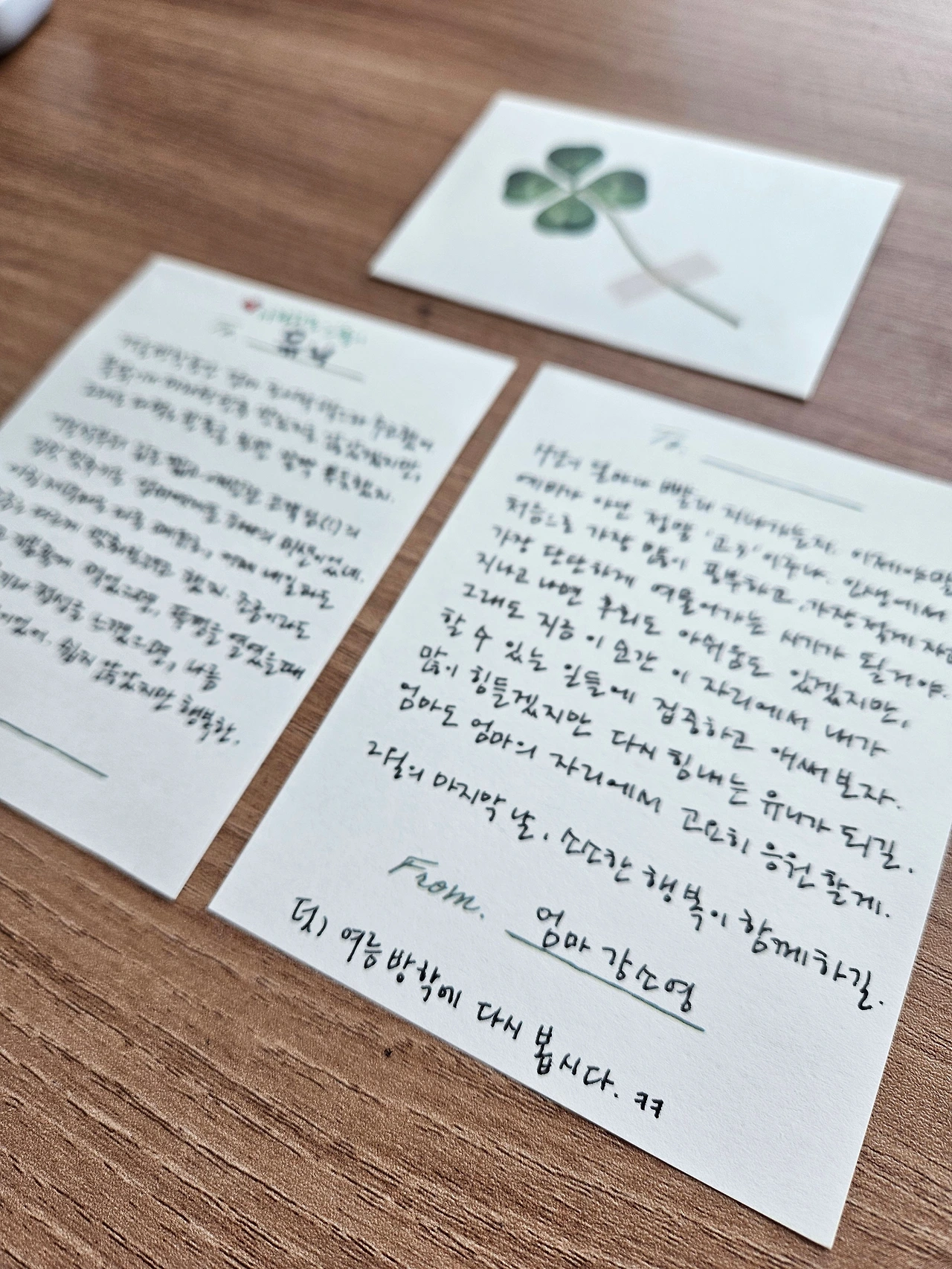 시간이 어찌나 빨리 지나가는지. 이제야말로 '예비'가 아닌 정말 '고3'이구나. 인생에서 처음으로 가장 많이 공부하고, 가장 적게 자고, 가장 단단하게 여물어 가는 시기가 될 거야. 지나고 나면 후회도 아쉬움도 있겠지만, 그래도 지금 이 순간 이 자리에서 할 수 있는 일들에 집중하고 애써 보자. 많이 힘들겠지만 다시 힘내는 유니가 되길. 엄마도 엄마의 자리에서 고요히 응원할게.