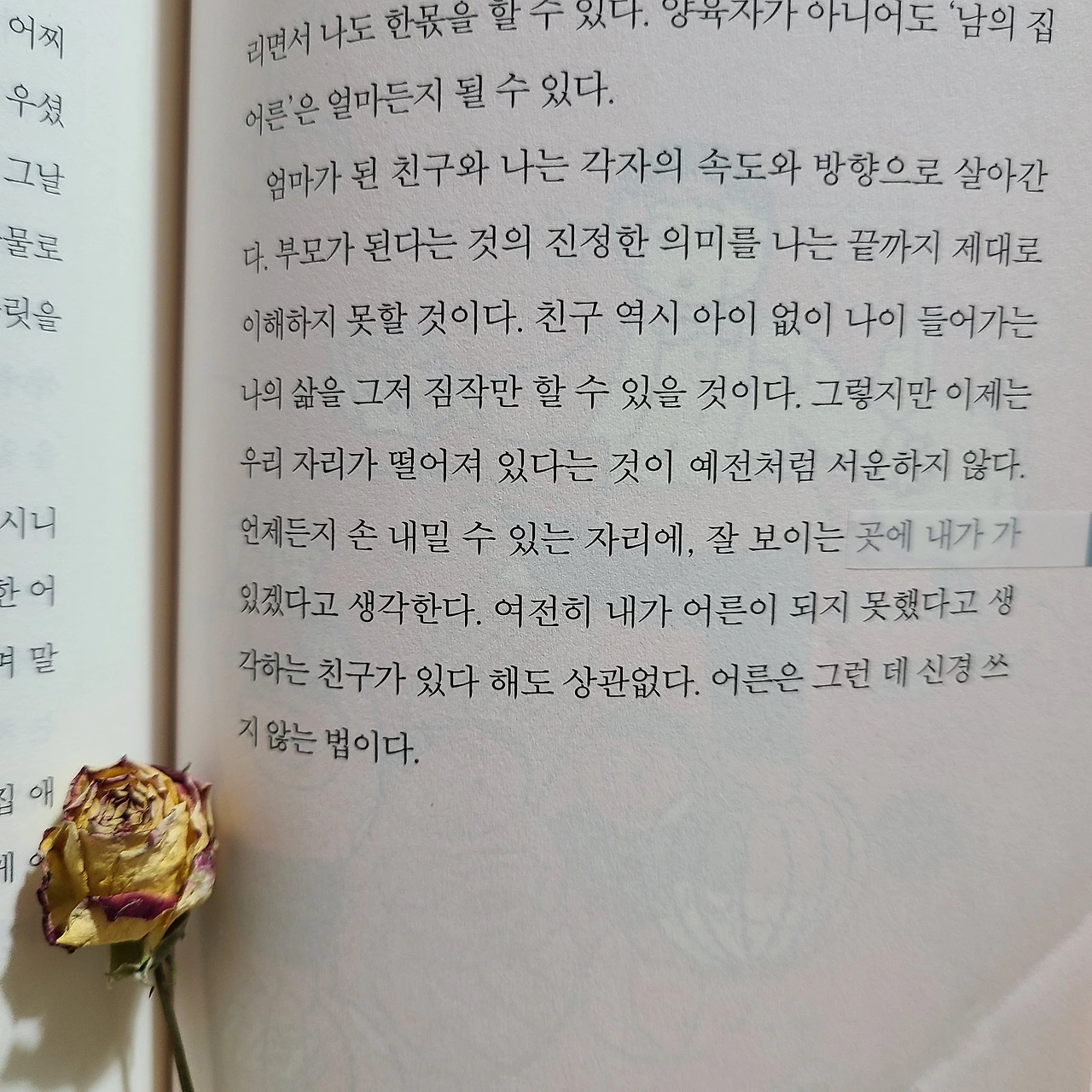 씬디 : 저도 여러 부분이 좋았어요. 이여사님과 겹치는 부분이 많고요. p.108에서 ‘어린이에게는 자매, 형제는 부모라는 절대적인 조건을, 지붕을 공유하는 동지다. 인생의 초기 단계에서 만나 평생을 알고 지내는 친구이기도 하다. 각자 서투른 채로, 서로의 사회화에 큰 영향을 끼치는 것도 바로 자매, 형제다’라는 부분에선 우리 집 어린이들 생각이 났어요. (정확히는 어린이 1명, 청소년 1명요.) 집에 있는 시간이 많은 요즘, 둘이서만 공감할 수 있는 얘기들로 시시덕거리는 모습을 보면 흐믓해요. ‘양육’에 대한 얘기도 좋았어요. 아이를 키우는 것만이 아니라 자신의 인생을 바꾸는 것까지가 양육이 아닐까. 기쁘고 보람 있는 동시에 책임감은 무겁지요.